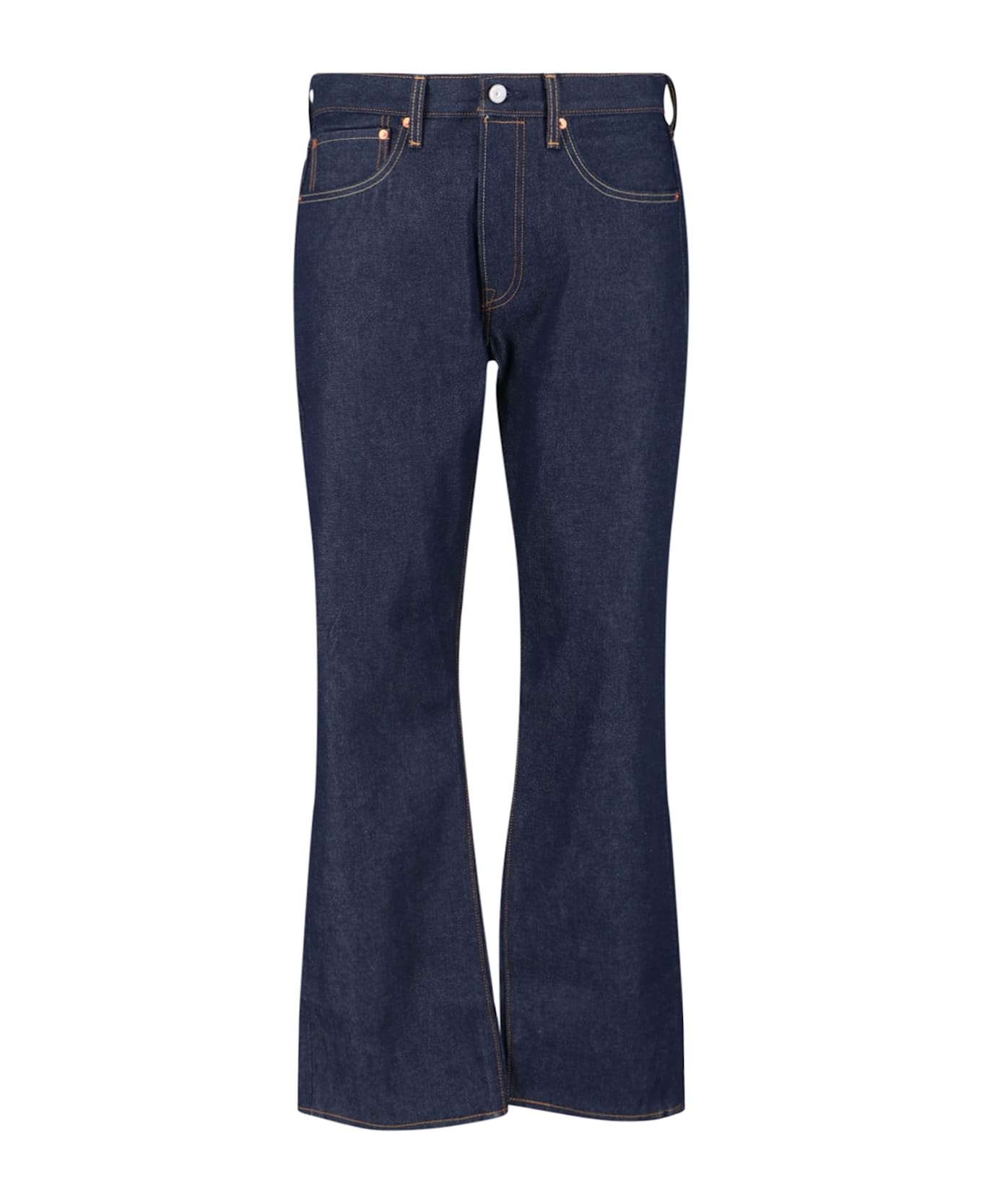Levi's Strauss 501 jeans in navy blue denim with mid waist, belt loops, button closure, five pockets, logo patch on the back, red logo label on the back, and straight leg. Composition: 100% Cotton