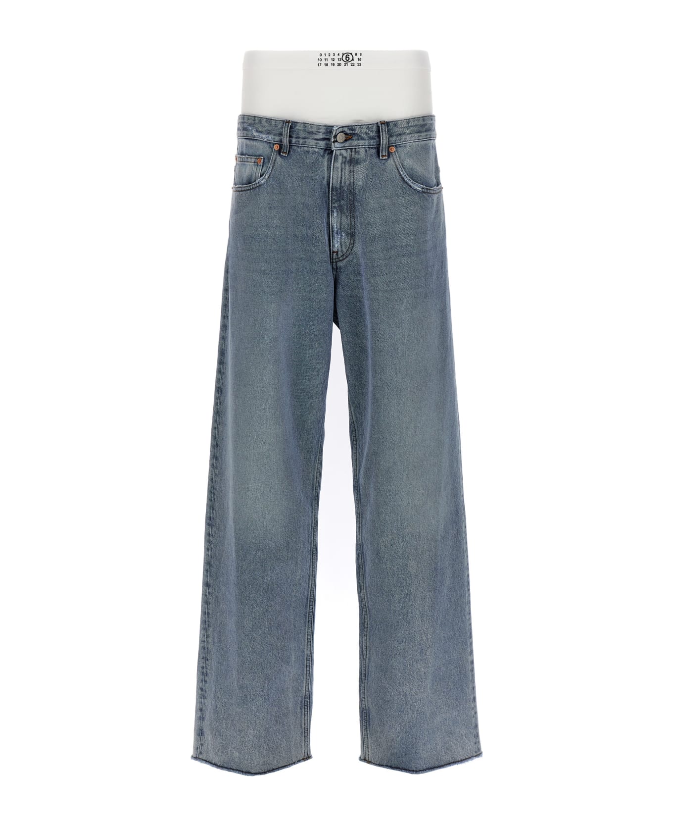 Denim jeans with boxer insert logo at the waist with drawstring, wide model with zip and button closure. Composition: 100% cotton