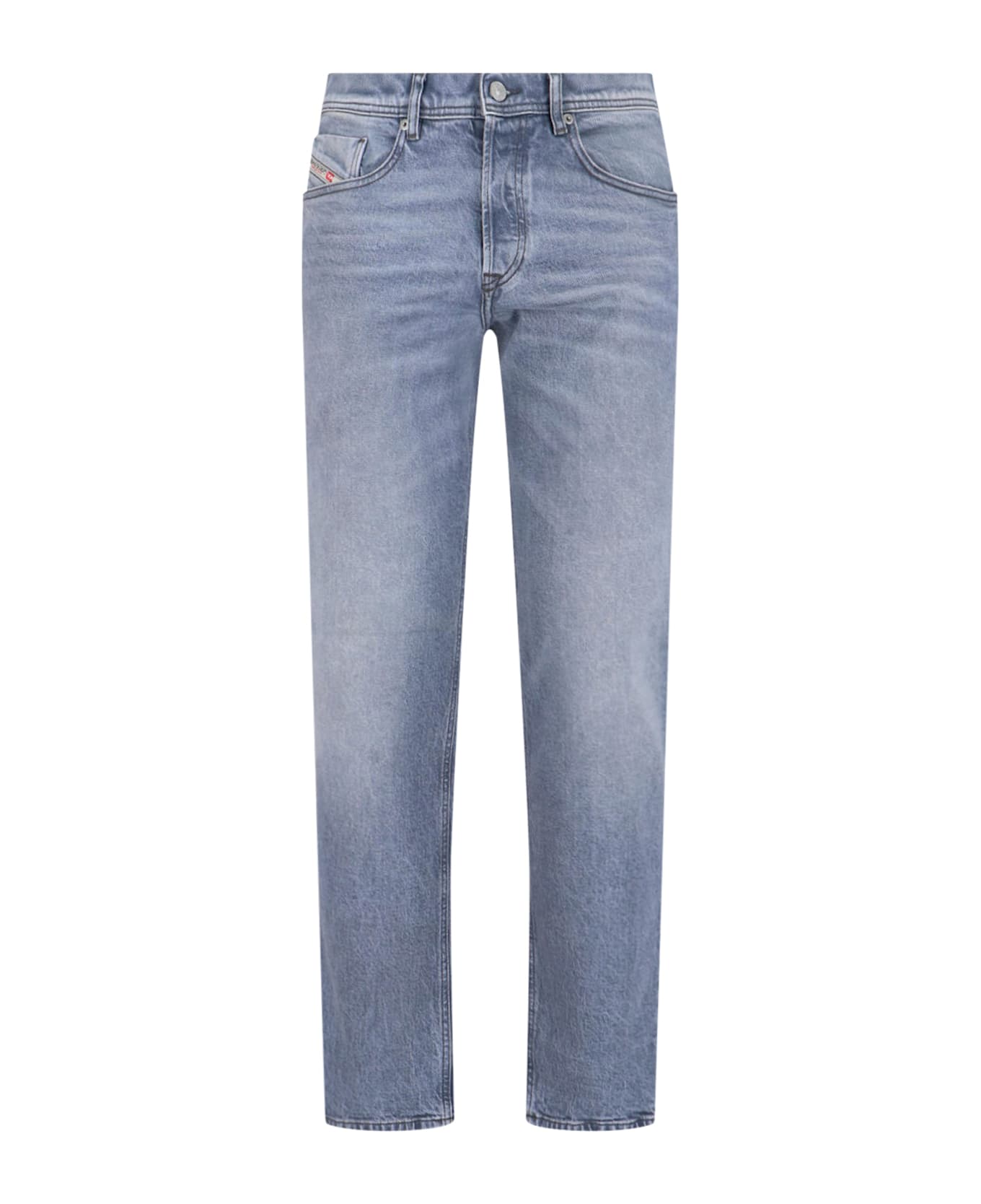 Diesel 'd-finitive' blue stretch cotton denim jeans with mid waist, button closure, belt loops, five pockets design, front logo label, back logo patch, contrast stitching at the back, slim leg. Composition: 99% Cotton, 1% Elastane