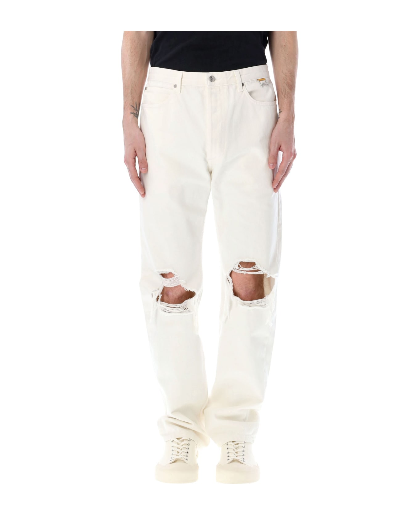 Cotton Distresses Denim Pants By Rhude. Featuring: Buttons Fastening Belt Loops Five Pockets Premium Leather Back Logo Patch Distressing At Knee Straight Cut The Model Is 1,90 M Tall And He's Wearing Size 34