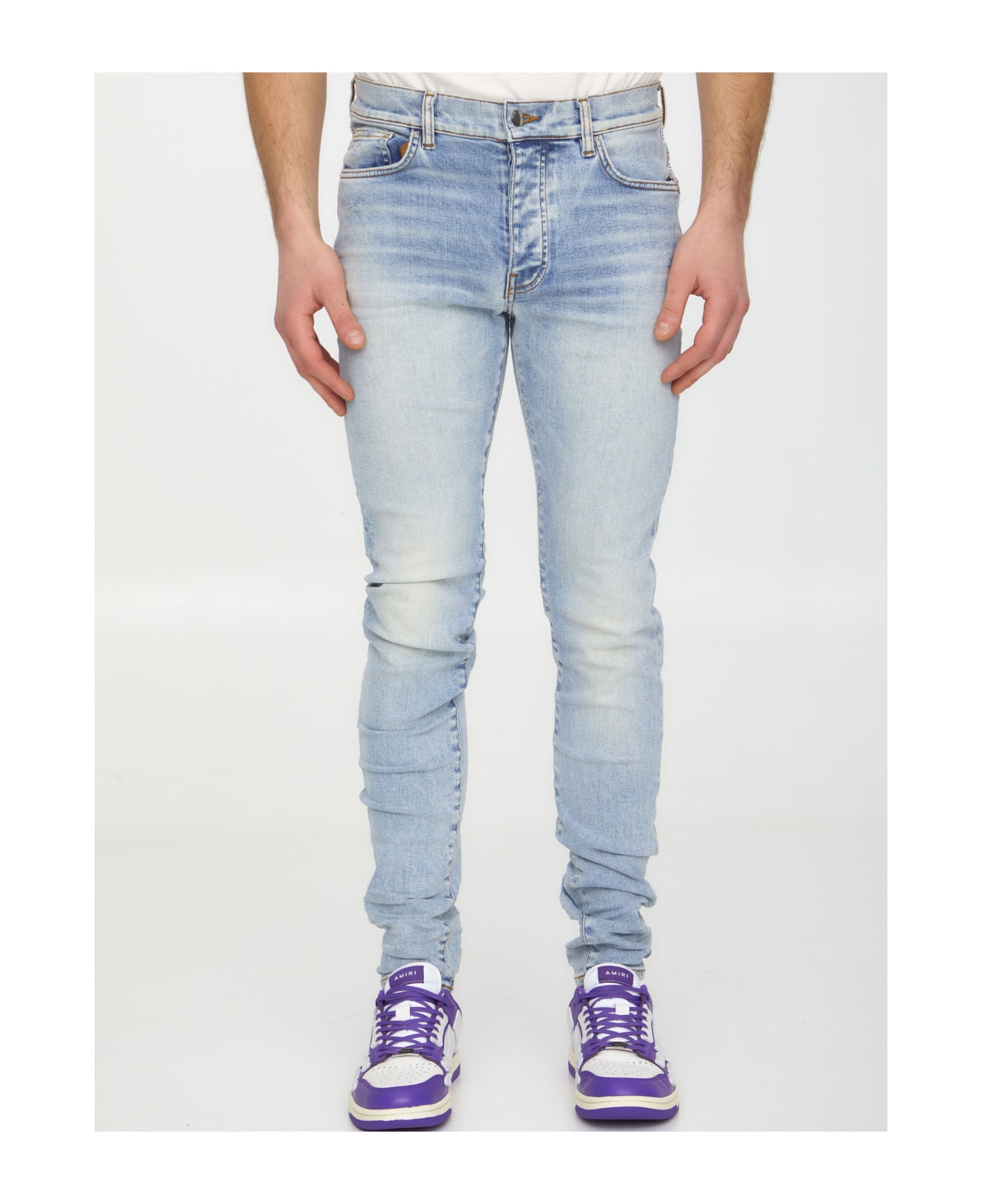 Skinny jeans in light-blue denim with washed-out effect. It features zip and button closure, five-pocket design, Amiri patch at the back and belt loops.