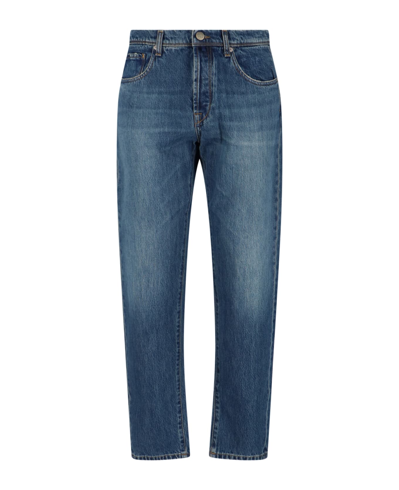 Incotex straight jeans in blue cotton denim with distressed wash, belt loops, button closure, five-pocket design, suede logo patch on the back, straight leg.