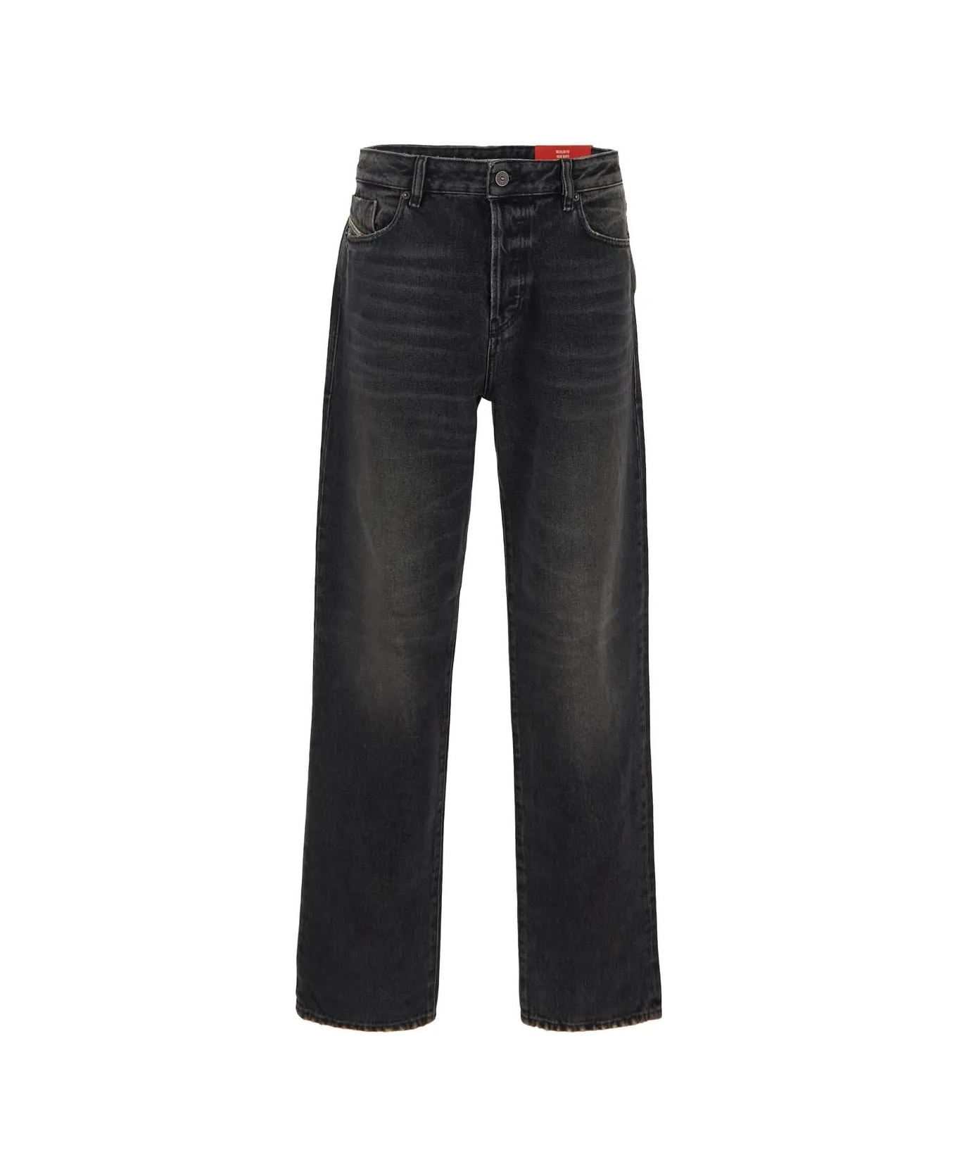 Diesel straight-leg jeans in black denim cotton with grey washed effect, belt loops, five-pockets design, ripped detailing, button fly logo patch on back waistband, high-waist and regular fit. Composition: 100% cotton Composition: 100 Af