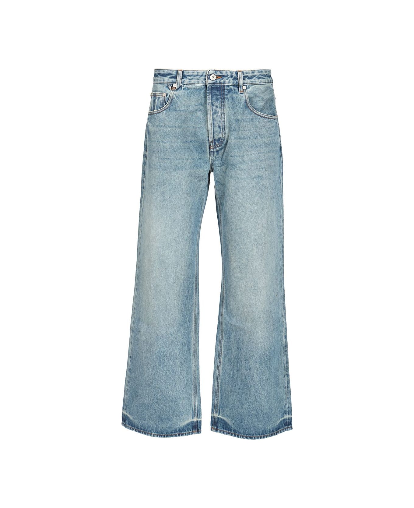Wide leg "de-Nîmes" denim trousers by Jacquemus, mid-rise, with a wide straight leg, five pockets with studs and metal rivets, a "J" belt loop, button fastening, silver-tone metal finishing, a large denim patch above the back pocket and contrasting stitching.