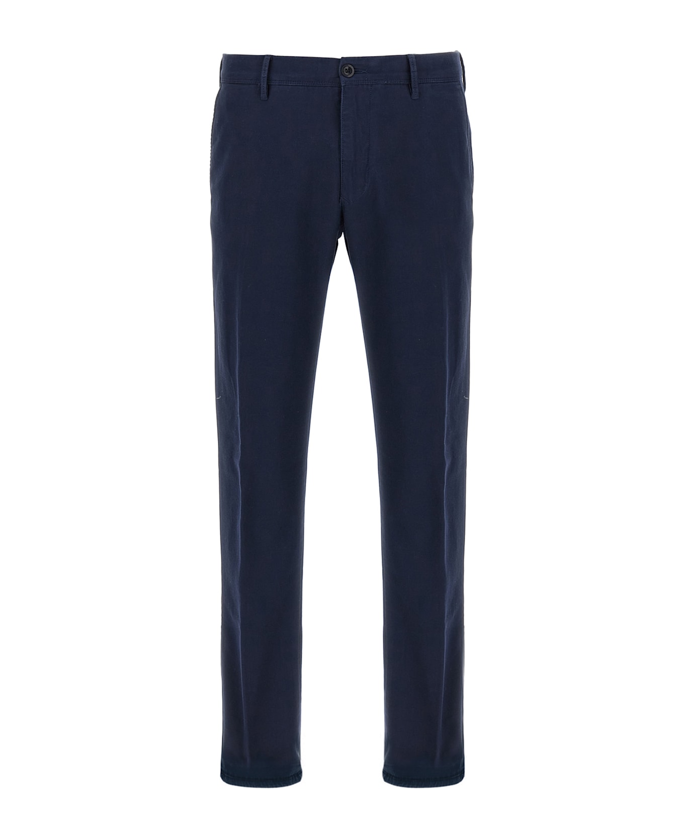 Slightly stretch cotton pants with low waist, zip and front button closure, pockets, straight leg.