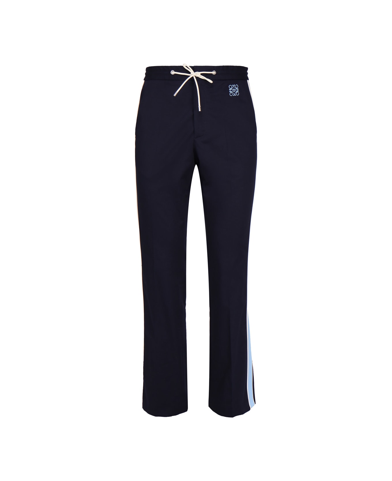 Midnight blue Tracksuit Trousers In Cotton from Loewe -Tracksuit trousers in compact stretch cotton twill -Regular fit -Regular length -Mid waist -Straight leg -Cotton tape along the sides with contrasted leather piping -Elasticated waist with leather drawstring -Concealed zip fastening -Slash pockets -Rear buttoned welt pocket -Anagram embroidery placed at the back -The size shown in the picture is 46 -Made in Italy -Colour: Midnight Blue -100% cotton