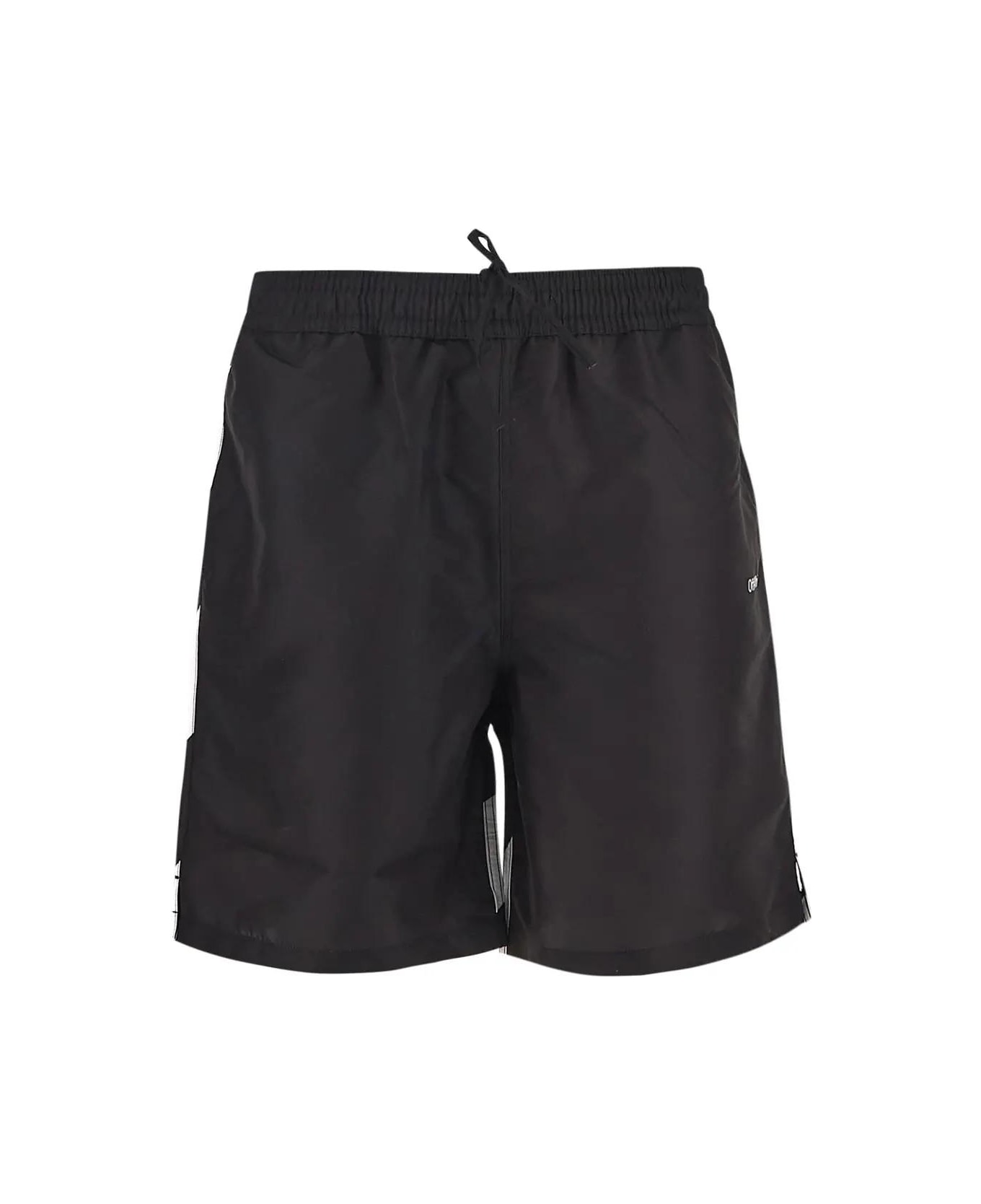 Off-White swim shorts in black polyester with diagonal white stripes at back, elasticated waistband with drawstring, side pockets, logo print at front and patch pocket at back with velcro closure. Composition: 100% Polyester