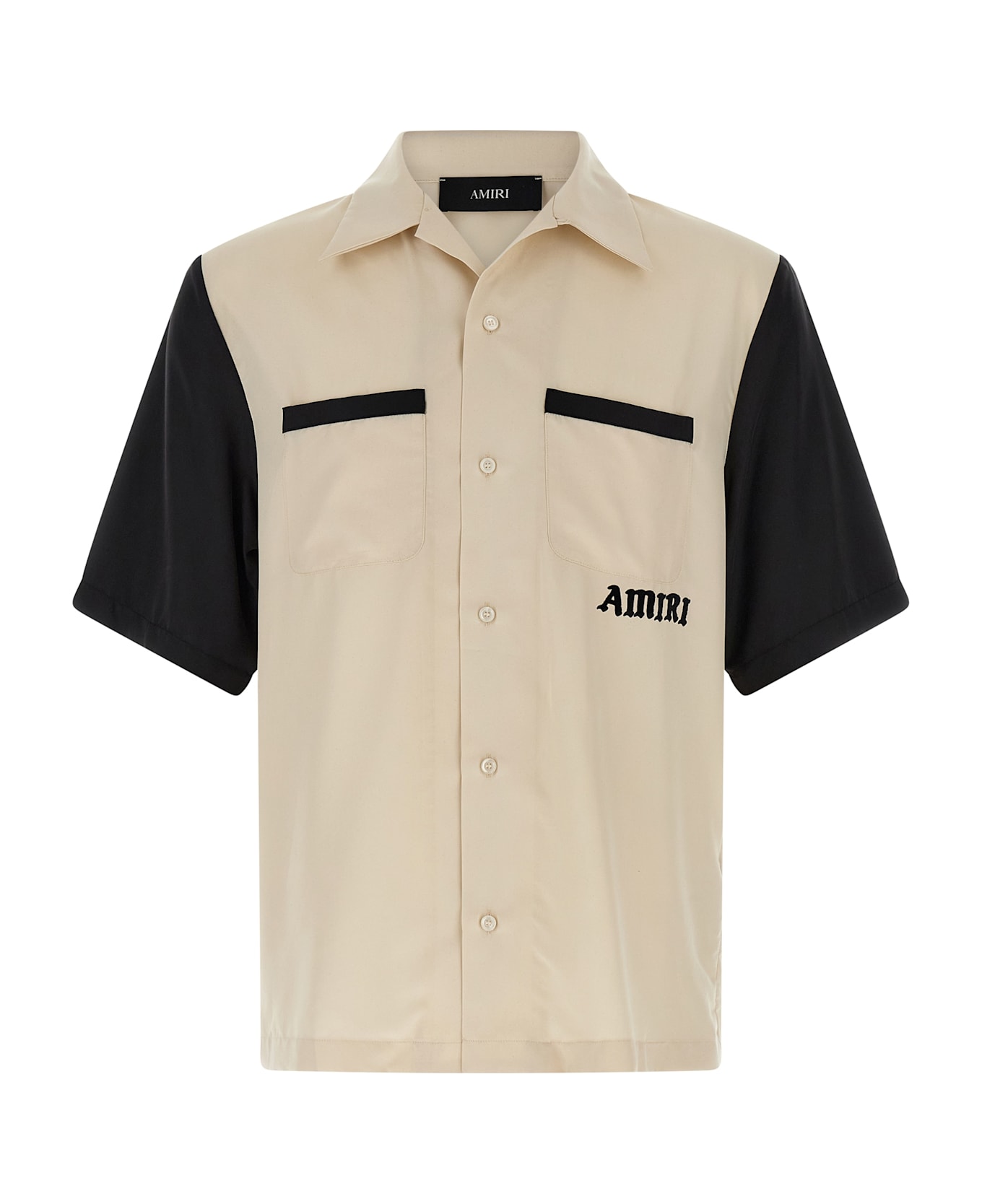 'Alabaster' V-neck shirt with button closure lapels, front pocket appliqué, front button closure, back flocked print and contrasting short sleeves.