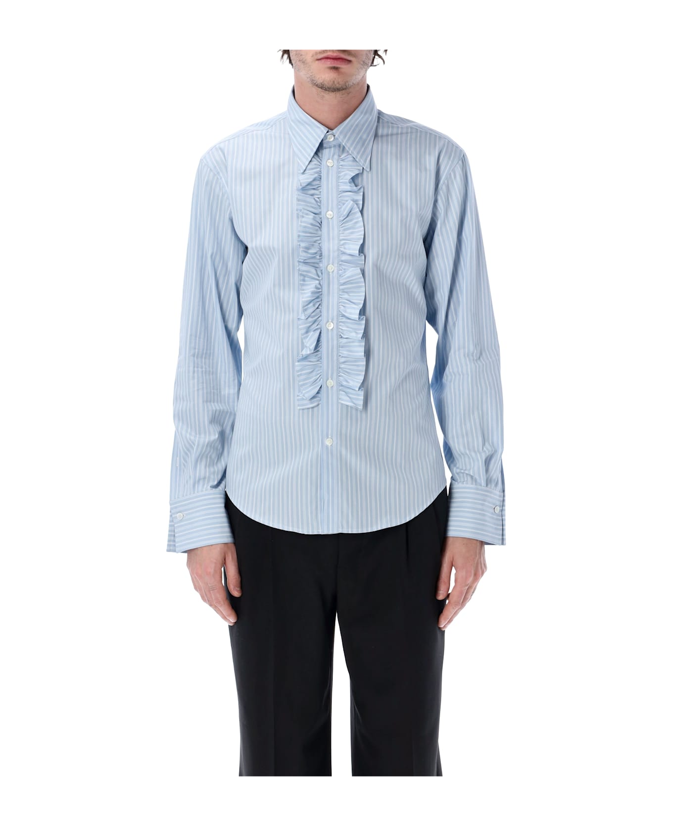 This Ruffled Shirt By Ami Paris Reinterprets Classic Tailoring With A Refined, Contemporary Twist. Crafted From Lightweight Striped Cotton, It Features A Vertical Ruffle Detail Along The Button Placket That Adds Movement And Character To The Clean Silhouette. The Structured Collar And Regular Fit Balance Elegance And Modernity, Making It A Distinctive Piece Suited To Both Formal And Creative Styling. Lightweight Striped Cotton Fabric Classic Pointed Collar Front Button Closure Ruffle Detail Along The Placket Long Sleeves With Buttoned Cuffs Regular Fit Andrea Is 1,90 M And Wears Size 40