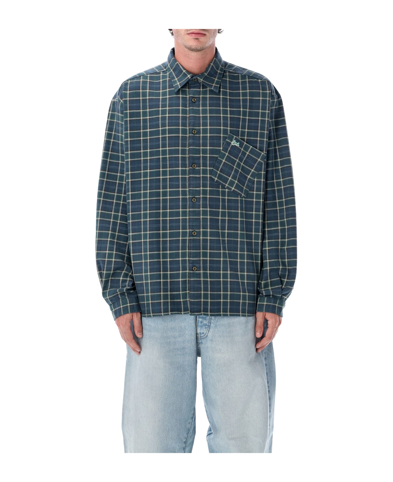 Relaxed In Shape And Bold In Spirit, This Erl Check Shirt Blends Vintage Flair With A Playful Twist. The Slanted Chest Pocket With Embroidered Logo Adds A Unique Accent To The Green And Blue Cotton Plaid, Making It Ideal For Layered Styling Or Worn Solo. Green And Blue Check Cotton Fabric Button-down Front Closure Slanted Chest Pocket With Erl Embroidery Single-button Cuffs Loose Fit Andrea Is 1,90 M And Wears Size M