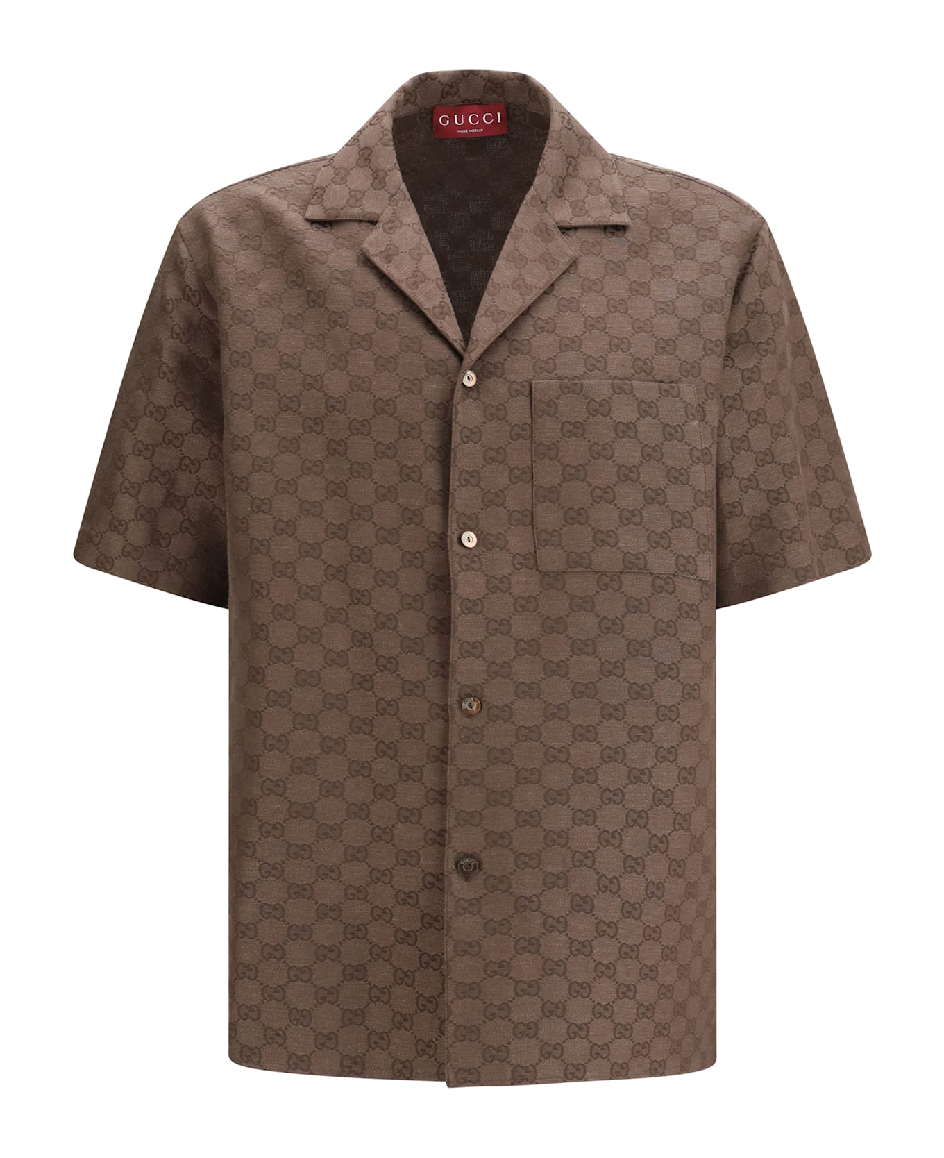 The gg linen blend bowling shirt by gucci is a fresh and modern piece, featuring brown fabric with the iconic gg motif. it has a pointed collar and dropped shoulders for a relaxed, contemporary fit. the short sleeves and chest pocket add a touch of functionality, while the matching side slits improve the fit. the button closure completes the design, making it ideal for a casual yet sophisticated look.