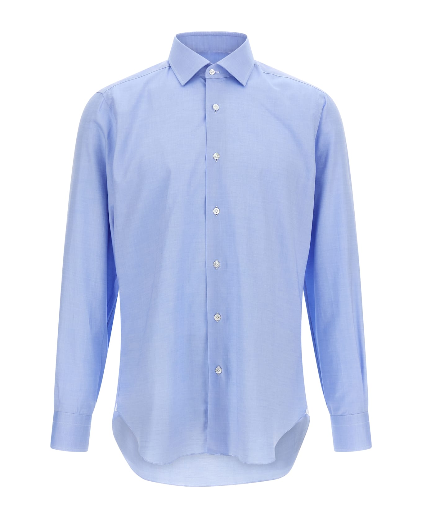 Hand-stitched Oxford cotton shirt, front mother-of-pearl button closure with classic lily stitching and embroidered buttonholes, long sleeves with round cuffs, rounded hem with contrasting satin logo detail on the side slits.