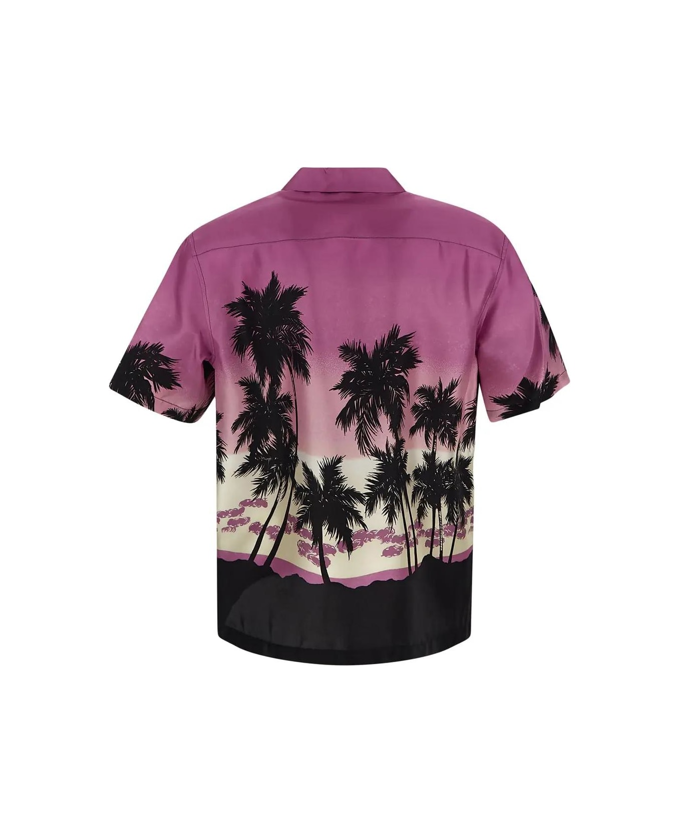 Palm Angels Pink Sunset bowling shirt in purple/black silk featuring sunset graphic printed all-over, spread collar, short sleeves, patch pocket on the chest, button closure, contrasting topstitching and logo label on the chest.