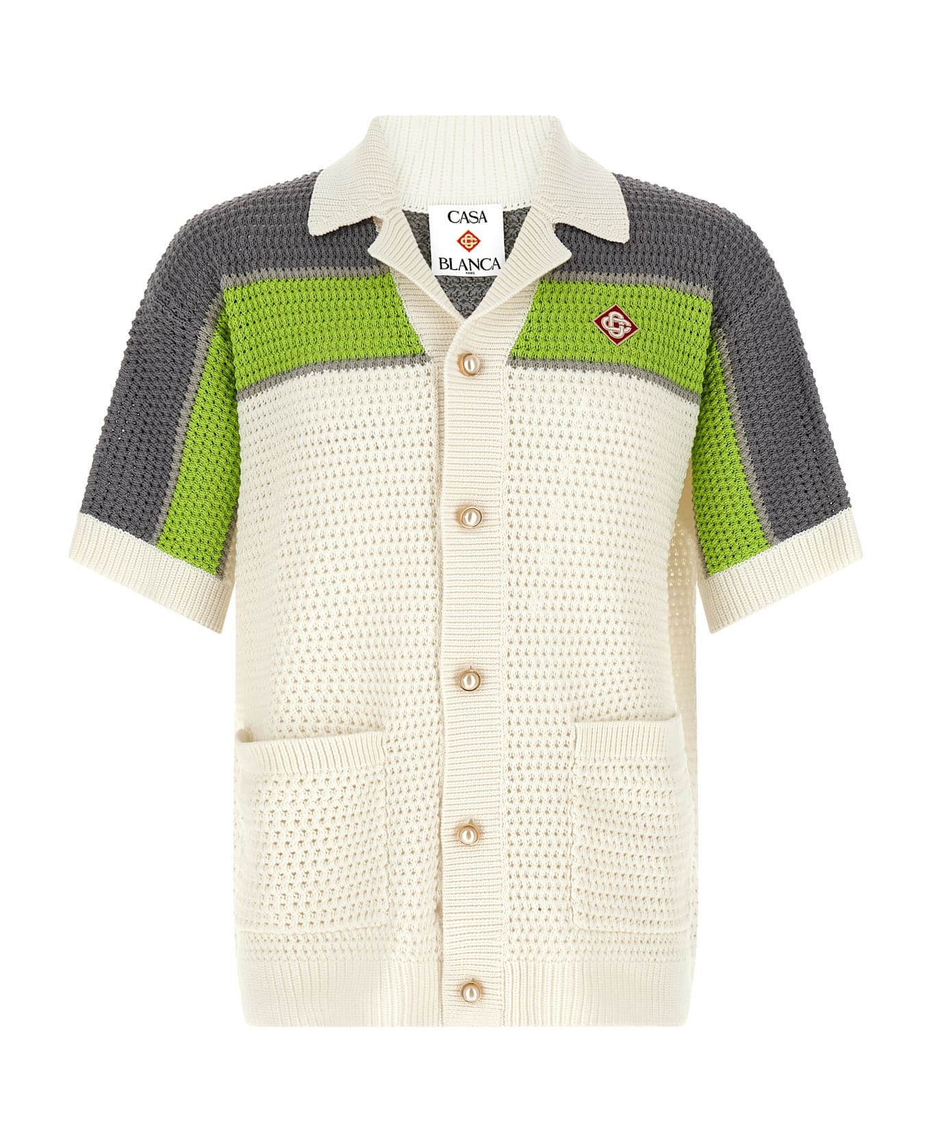'Stripe Crochet' crocheted cotton shirt with striped details on the shoulders, sleeves and chest, logo patch and button closure with gold edging and front pearl, short sleeves with cuffs, pockets. Composition: 100% cotton