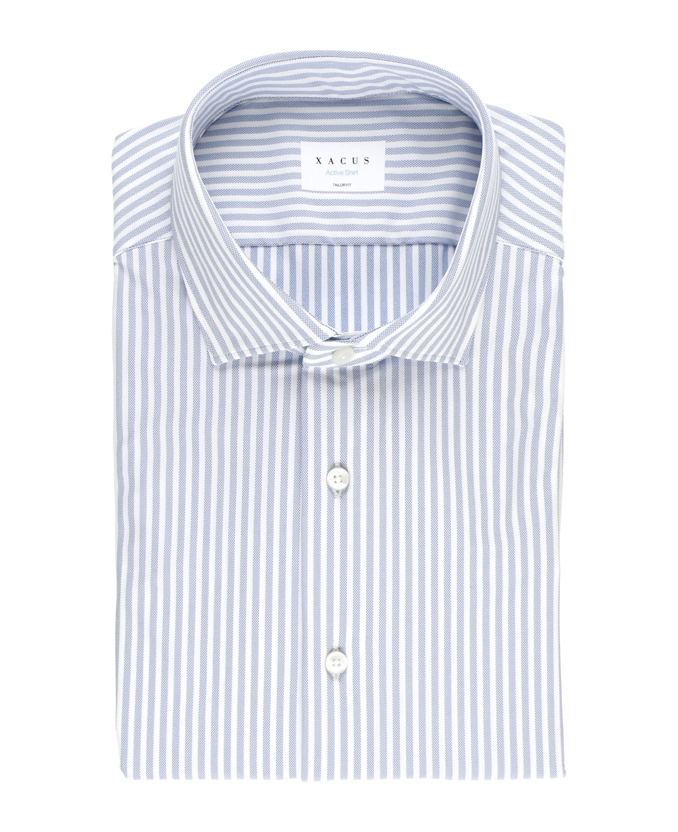 - Blue Xacus shirt for man - All-over striped pattern - Collar - Long sleeves with buttons at hem - Front buttoms fastening