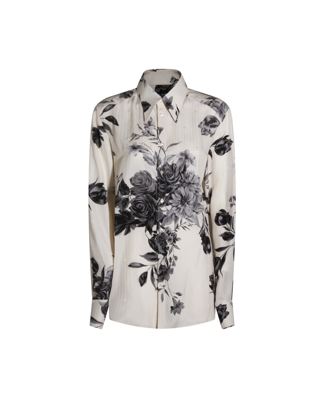 White and black silk shirt from Dolce&Gabbana featuring long sleeves, shirt collar, buttons fastening, flowers print and regular vestibility. Composition: _, 100% Silk