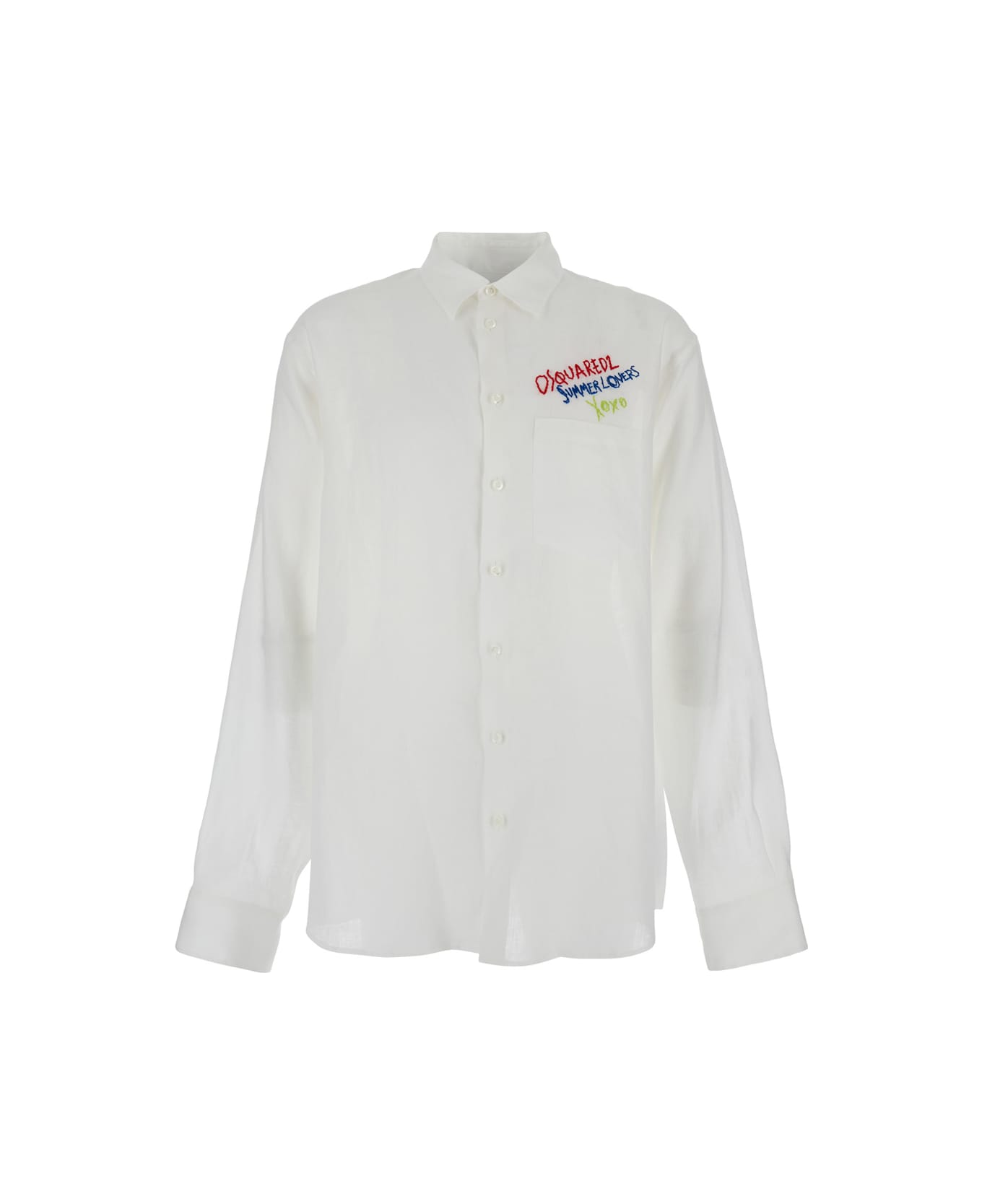 White Shirt With Classic Collar And Embroidered Logo On The Front In Linen Man