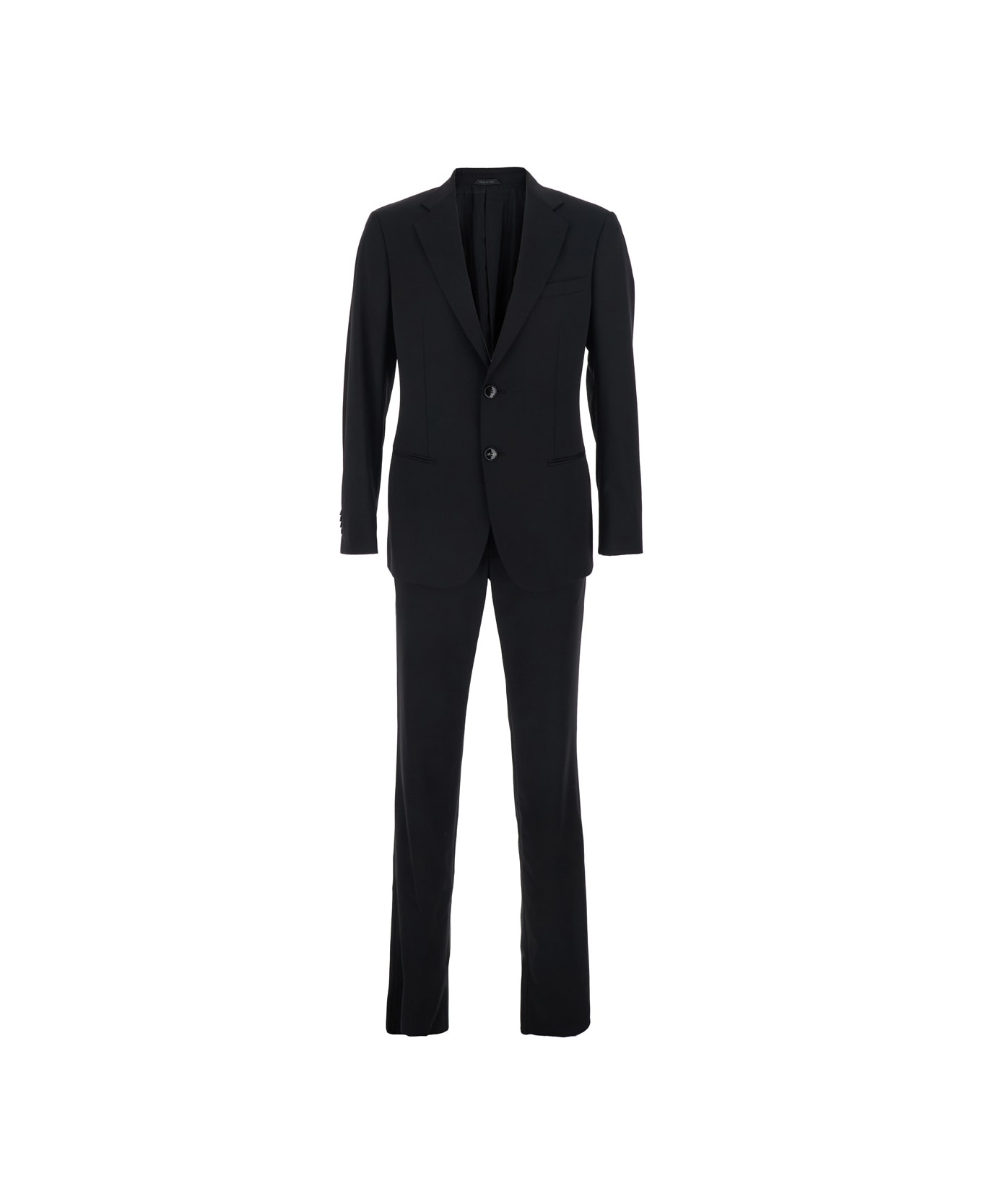 Single-breasted suit , black color. Notched revers. Jacket with long sleeves and button closure at the front. Features a chest pocket and two side pockets. Buttoned cuffs and straight hem. Trousers with hidden closure at the front and straight hem. In Wool. Regular fit.
