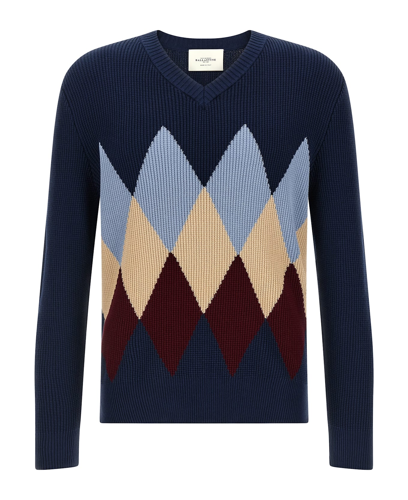 Waffle stitch cotton sweater with front Argyle jacquard pattern, V-neck, long cuffed sleeves.