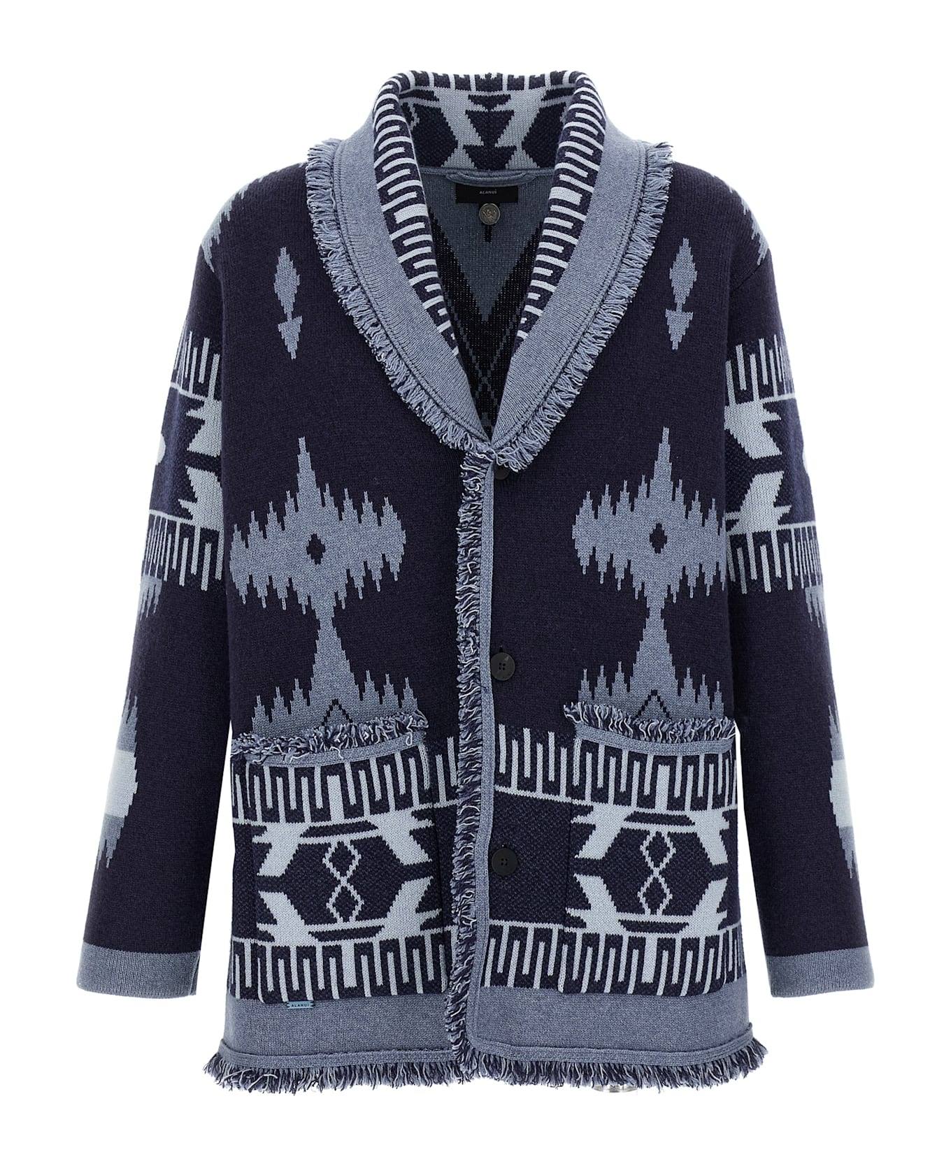 'Icon' cashmere cardigan with all-over jacquard pattern, V-neck, front button closure, pockets, long sleeves, fringes at the edges. Composition: 100% cashmere