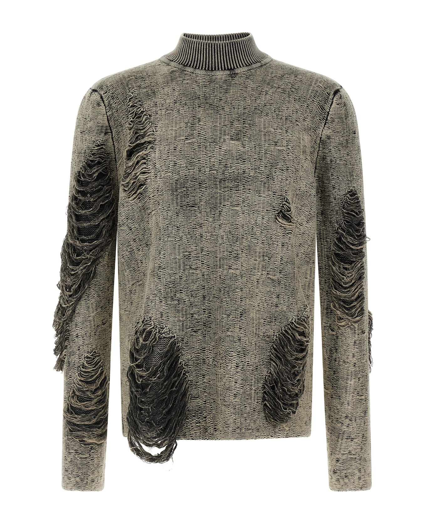 'K-Fjordi' sweater in cotton yarn with overdyed processing enriched with rips, stretch marks and floating threads, crew neck, long sleeves with cuffs and dropped shoulder. Composition: 100% cotton