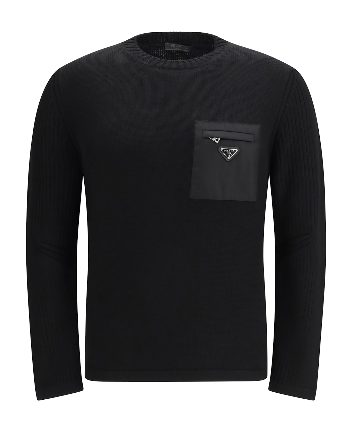 The virgin wool sweater by prada is a simple yet sophisticated garment, made from pure virgin wool to ensure comfort and warmth. the metal triangle logo on the chest adds a distinctive touch, symbolizing understated elegance. the crew neck, ribbed cuffs, and hem finish the design with a classic and functional detail. a chest pocket completes the design, making the sweater not only elegant but also practical and modern.