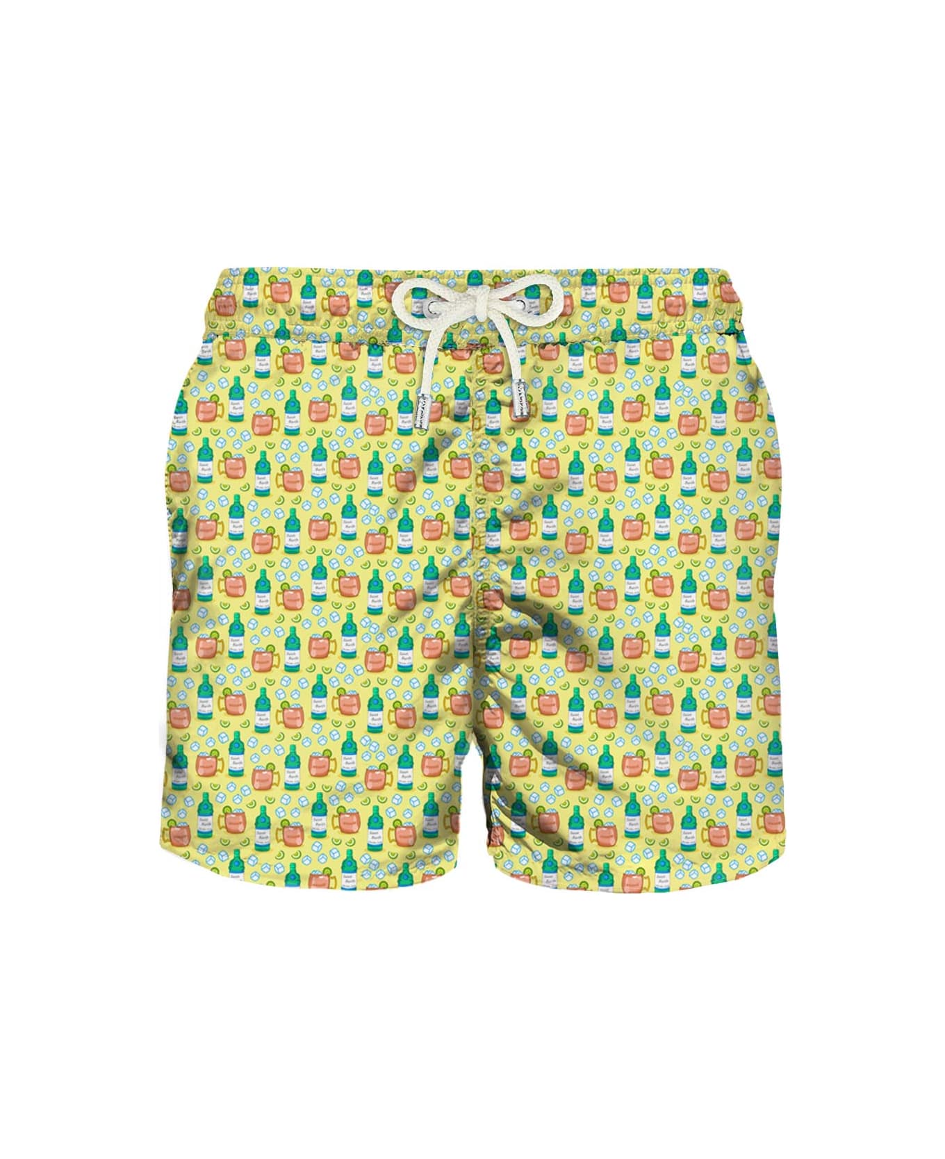 Man's classic swim shorts Cocktail micro print Yellow background Quick drying Mid-lenght Light net lining Elasticated waistband Drawstring fastening Front and back pockets