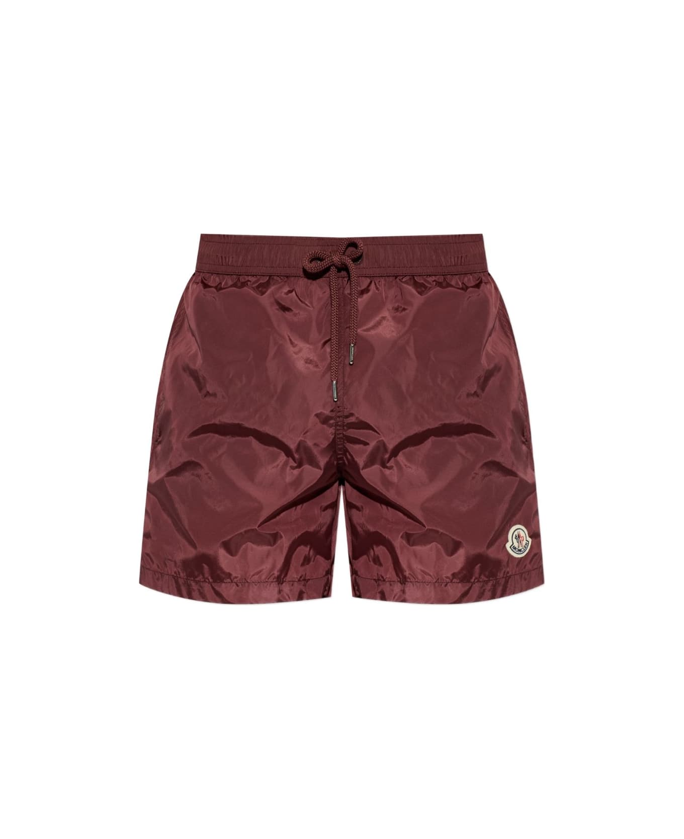 burgundy drawstring fastening logo patch side stripe detail rear zip-fastening pocket elasticated waistband Be mindful to try on swimwear over your own garments.