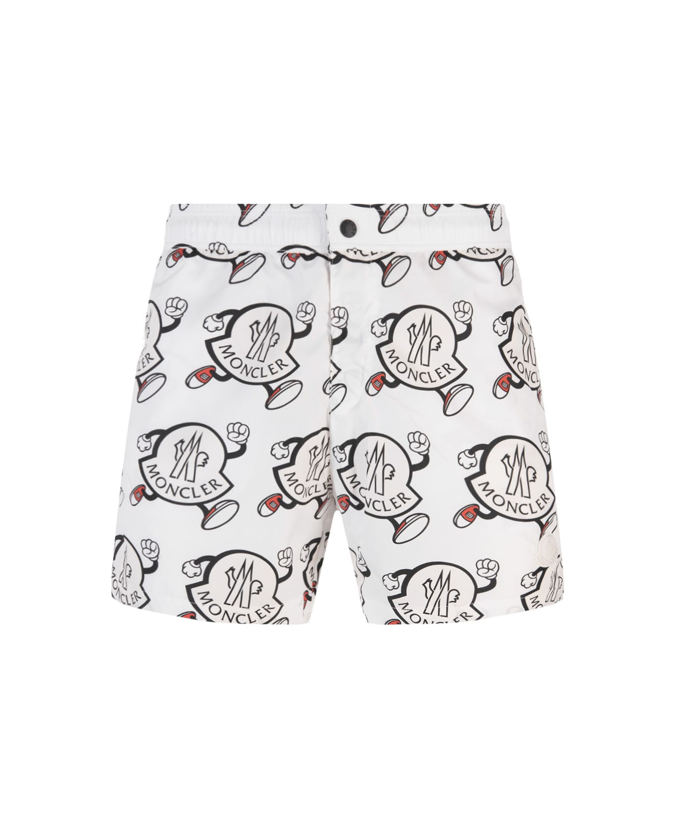 Moncler swim shorts made of white beachwear nylon and decorated with a new print in which the brand logo comes to life and starts running. The garment features a jacquard logo, flush side pockets, patch pockets on the back and a waistband with internal drawstring.