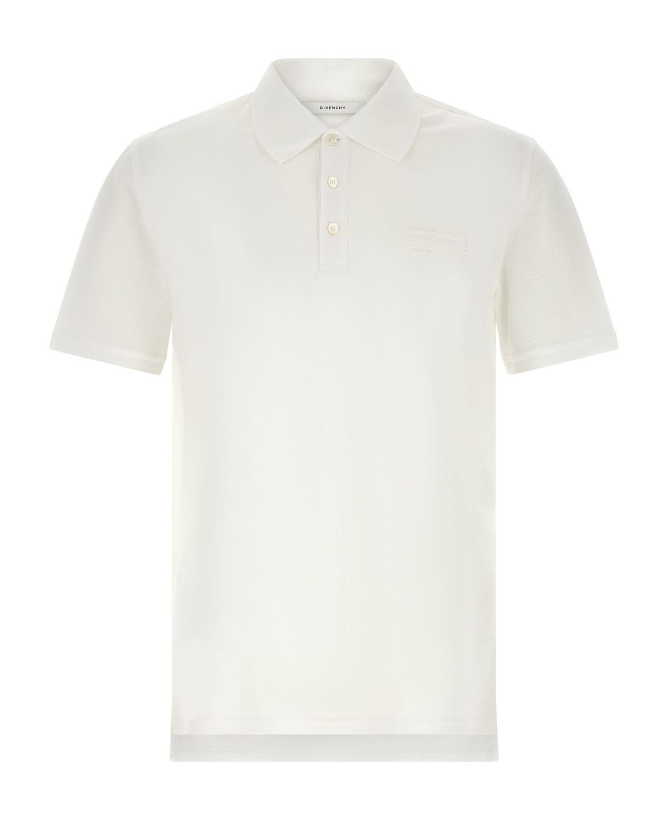 Piqué cotton polo shirt, grosgrain 'GIVENCHY Paris' patch with tone-on-tone zigzag stitching on the front, collar and buttons, short cuffed sleeves, side slits, and asymmetrical hem. Composition: 100% cotton