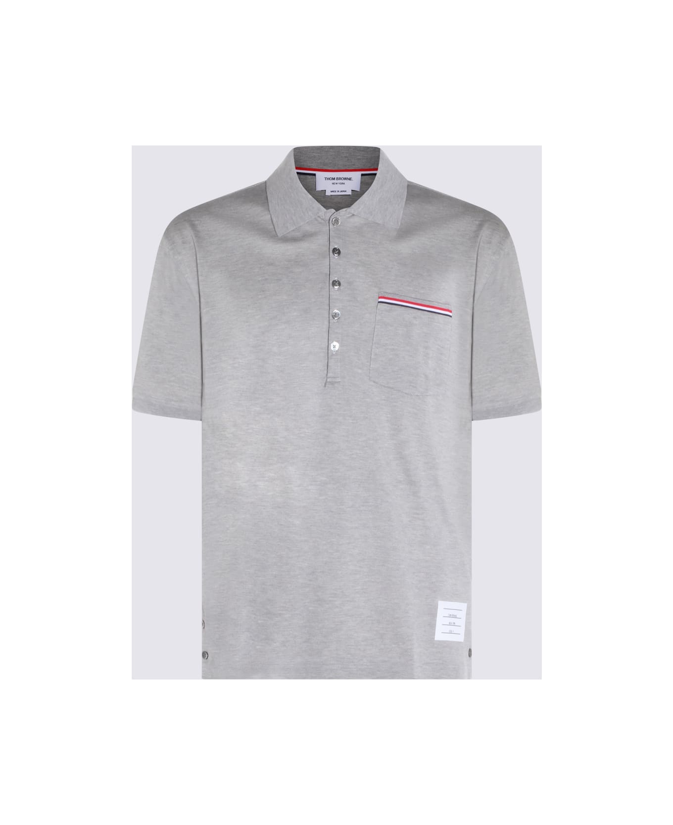 Light grey cotton polo shirt from Thom Browne featuring classic collar, buttons fastening, short sleeves, pocket with stripes detail and regular vestibility. Composition: _, 100% Co