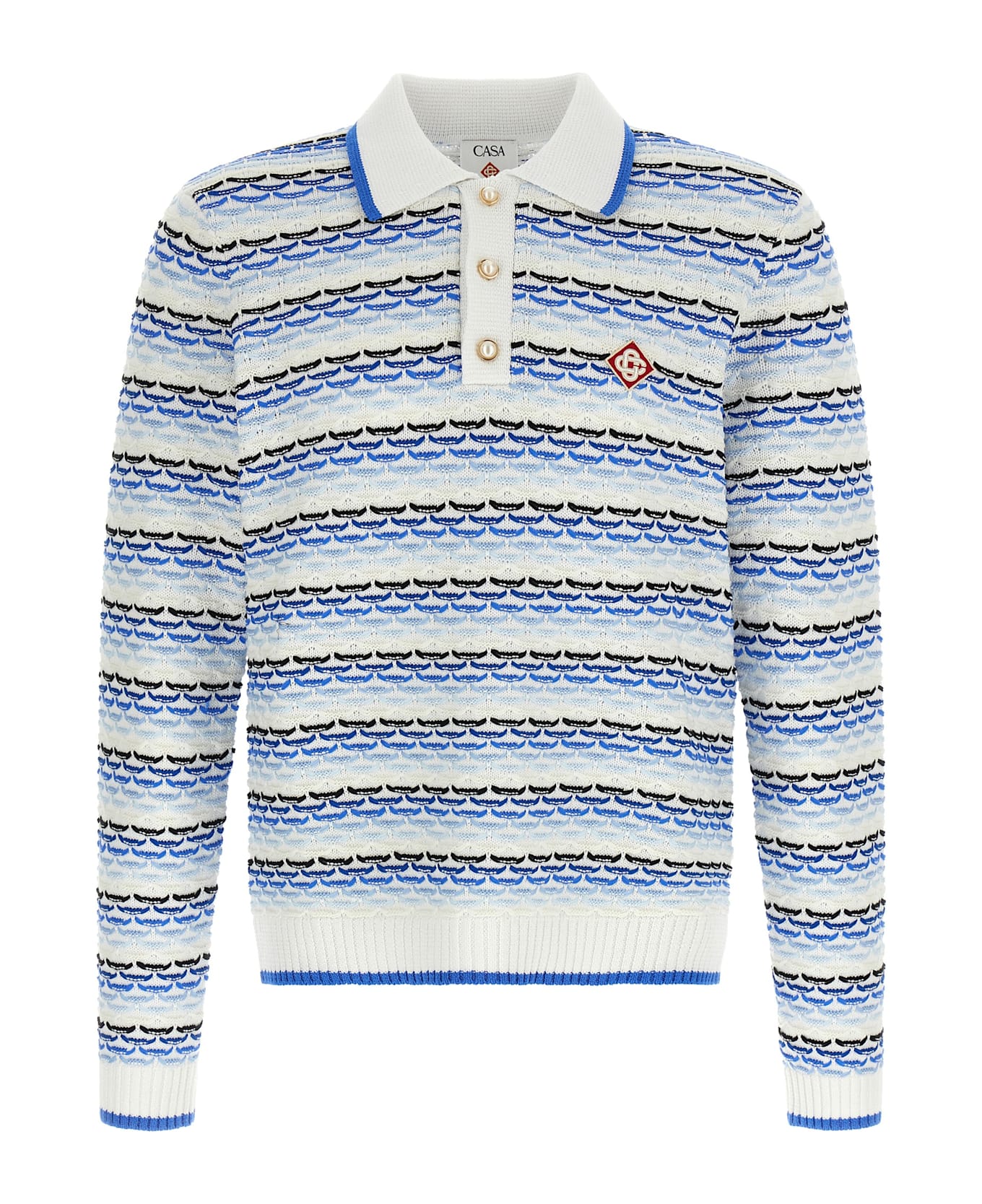'Tuck Stitch Long Sleeve' cotton knit polo shirt with tuck stitching, metal collar and buttons with pearl, front logo patch, long sleeves with cuffs and dropped shoulder, and headband. Composition: 100% cotton