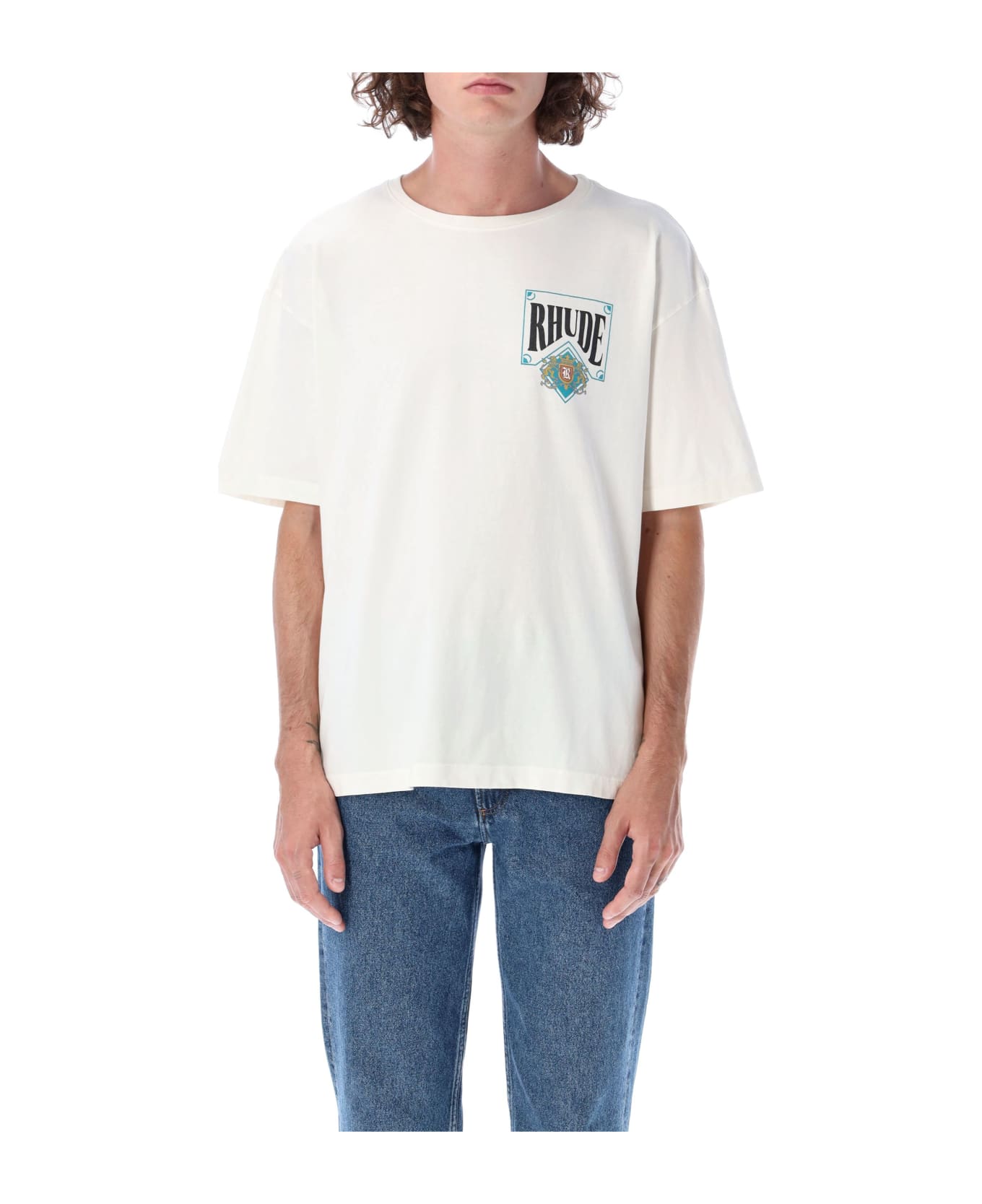 Vintage White Cotton Card T-shirt By Rhude. Featuring: Ribbed Crewneck Short Sleeves Graphic Print At Chest And At Back Straight Hem Loose Fit