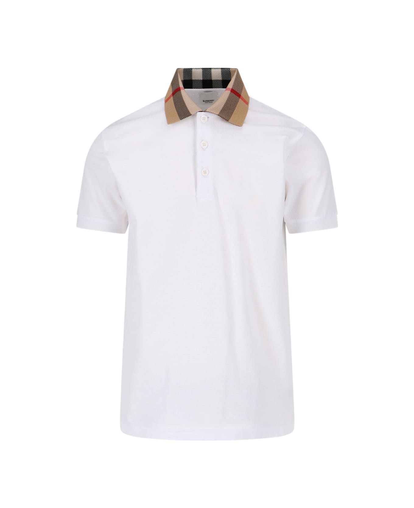 Burberry Check collar polo shirt in white cotton with beige check collar, front buttons, and straight hem. Composition: 100% Cotton