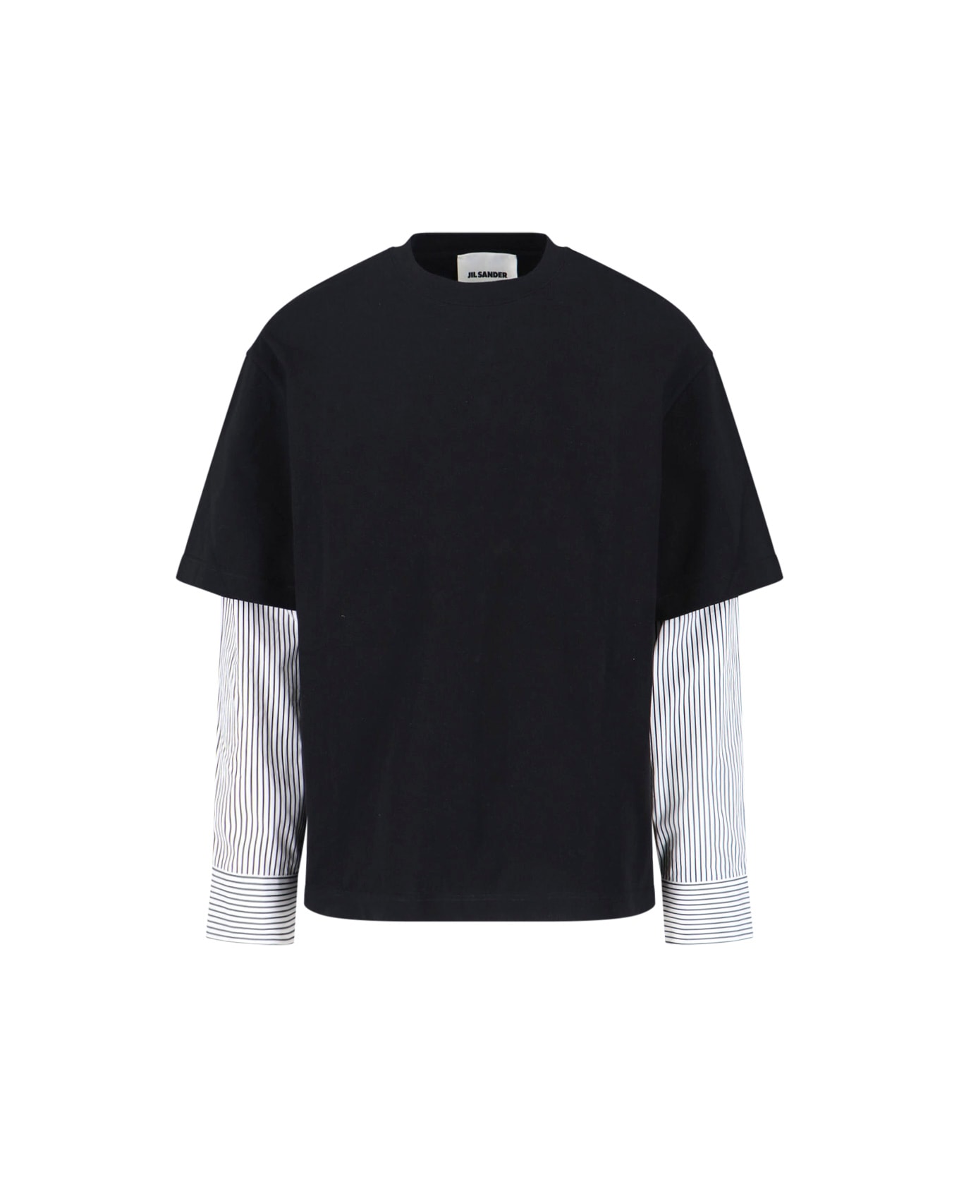 Jil Sander crew neck t-shirt in black cotton, long sleeves with striped pattern, buttoned cuffs, straight hem. Composition: 100% Cotton