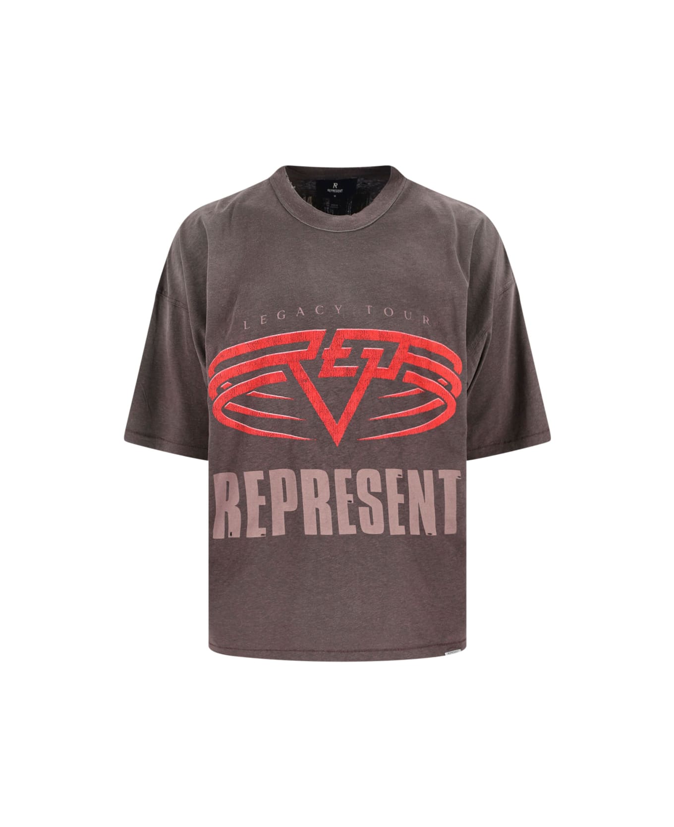 Represent 'Legacy Tour' brown cotton blend crew neck t-shirt with dropped shoulders, short sleeves, maxi multicolor logo print on the front, silver metal hardware logo detail on the front, maxi multicolor logo print on the back, ribbed trims, straight hem.