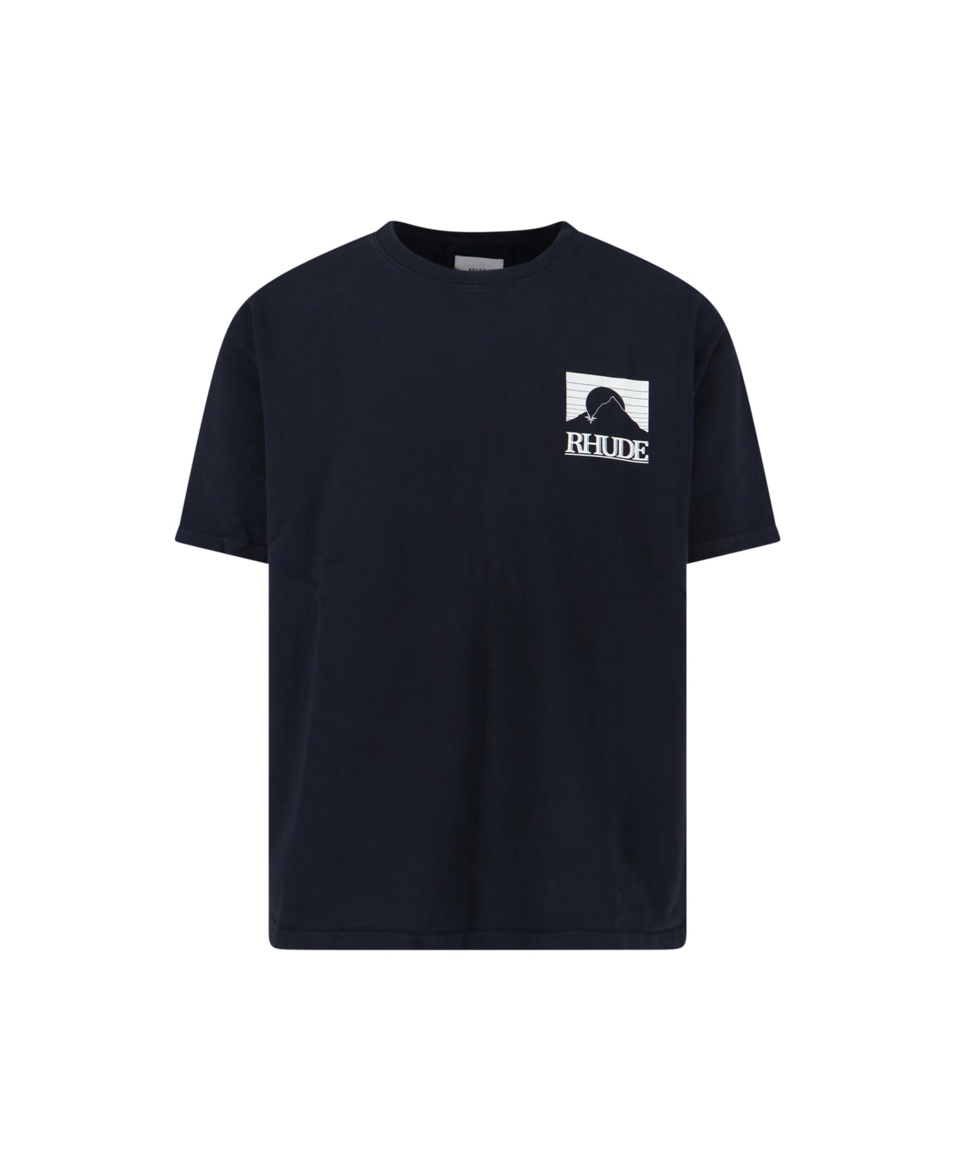 Rhude 'Moonlight' black cotton crew neck t-shirt with short sleeves, contrast logo print on the front, maxi logo print on the back, ribbed trims, straight hem. Composition: 100% Cotton