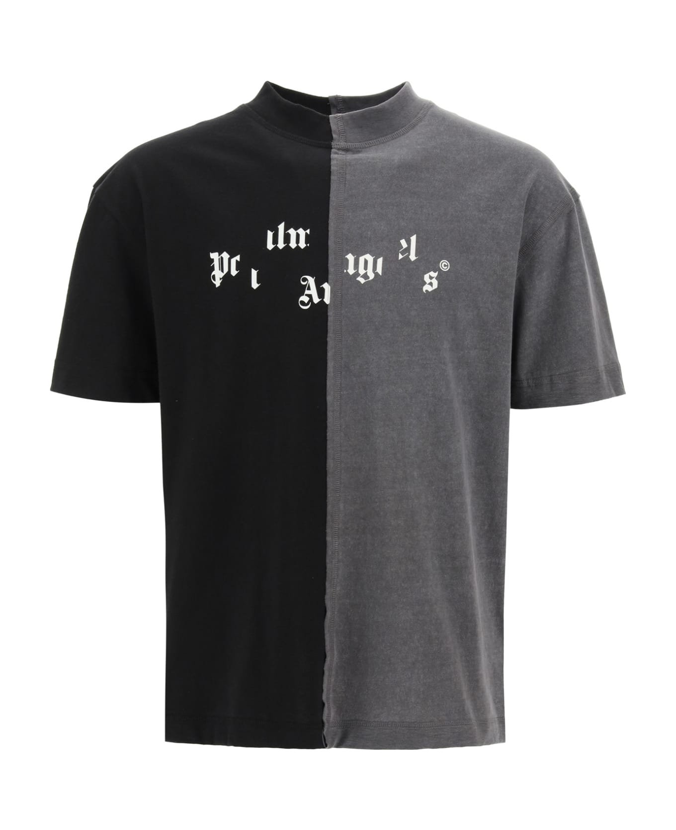 Crewneck t-shirt in cotton jersey by Palm Angels, enhanced by a two-tone panelled construction and Broken Logo front print. Ribbed neck, loose fit. The model is 187 cm tall and wears a size L. Composition: 100% cotone