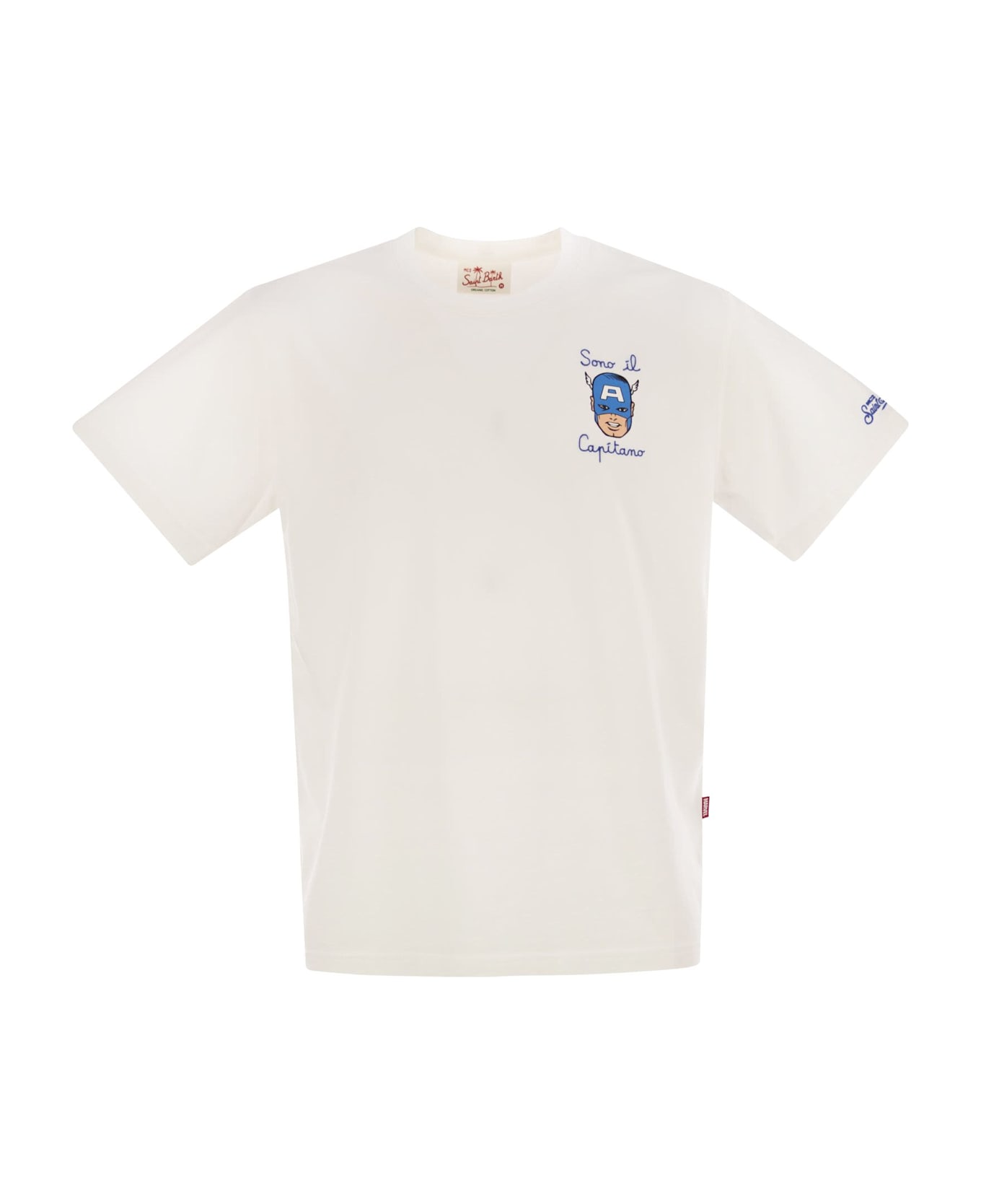 Introducing the iconic men's t-shirt from MC2 Saint Barth, featuring big, bold prints on the brand's favourite themes, including travel, lifestyle, iconic destinations, cocktails and the coolest collaborations. This men's half-sleeve t-shirt is made from 100% organic cotton jersey fabric. It has a regular fit for comfortable wear and is adorned with embroidery on the chest, as well as MC2 Saint Barth embroidery on the bottom of the left sleeve. - Left chest print - Crew neck - Short sleeves - Signature embroidery MC2 Saint Barth on left sleeve - Classic fit DESIGNER ID: TSHM001 04964H