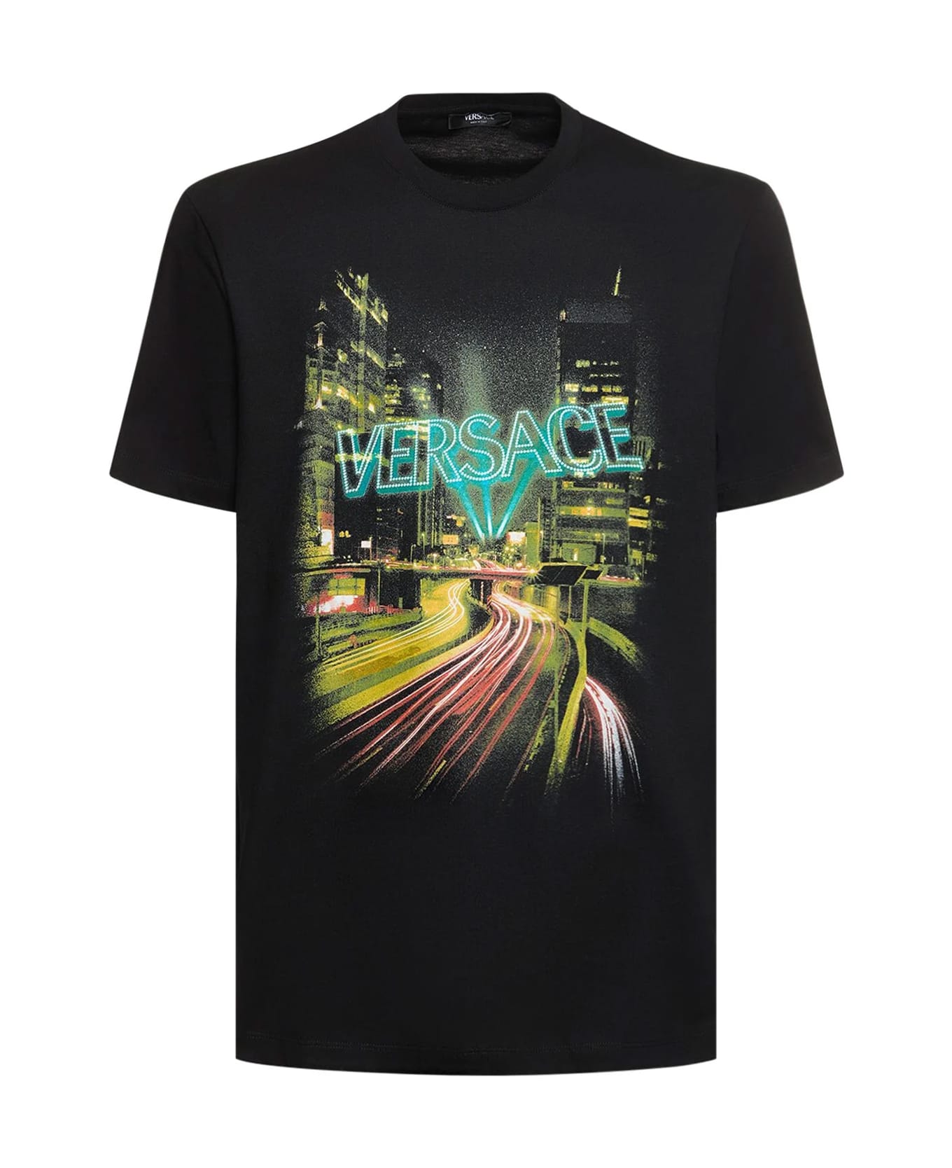 - Ribbed Crew-neck - Short Sleeve - Multicolor Versace City Lights Motif - Made In Italy - 100% Cotton