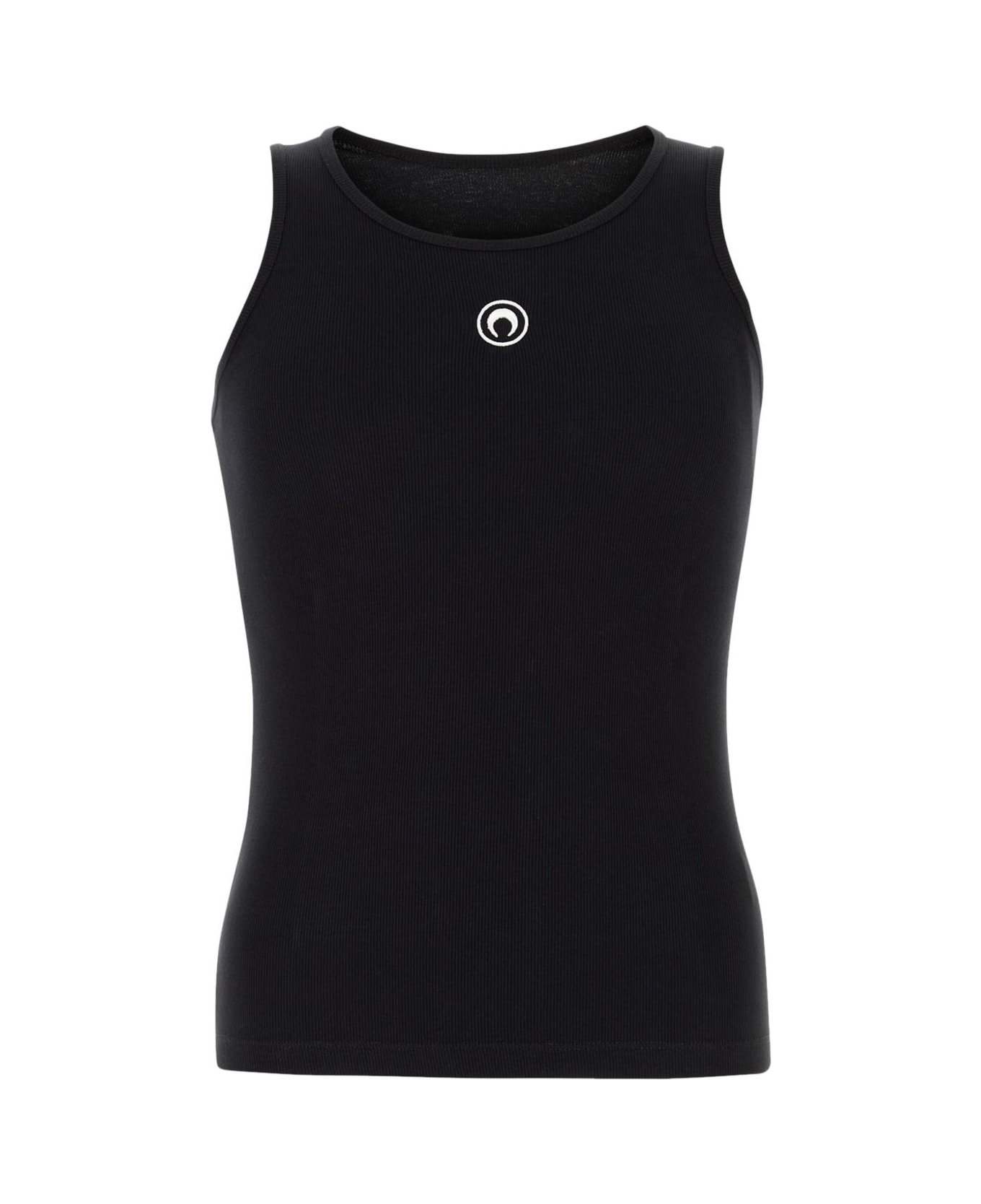 black stretch-cotton fine ribbed round neck sleeveless Crescent Moon embroidery to the front logo patch to the rear straight hem
