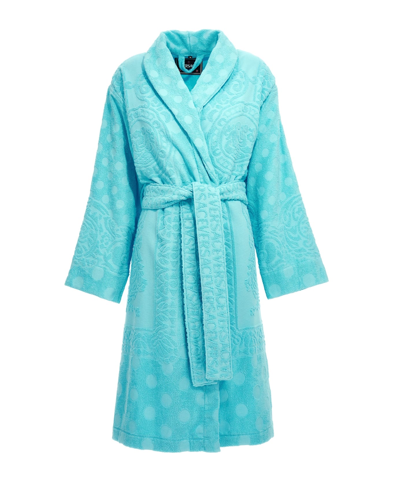 La Vacanza cotton terry cloth caspule bathrobe with tone-on-tone 'Seaqué Baroque Polka Dot' pattern and a belt to be tie at the waist. Composition: