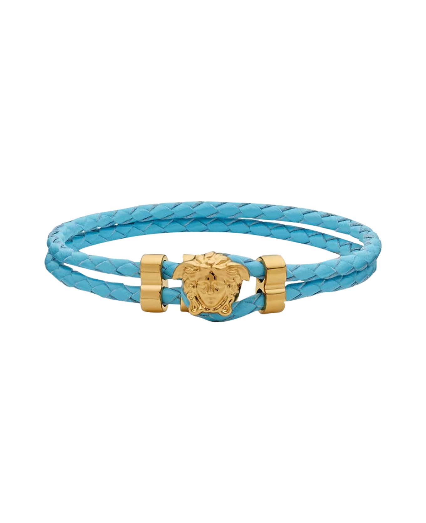 Versace light blue Medusa braided leather bracelet, frontal gold logo Composition: 100% Calf Leather /, 100% Metal