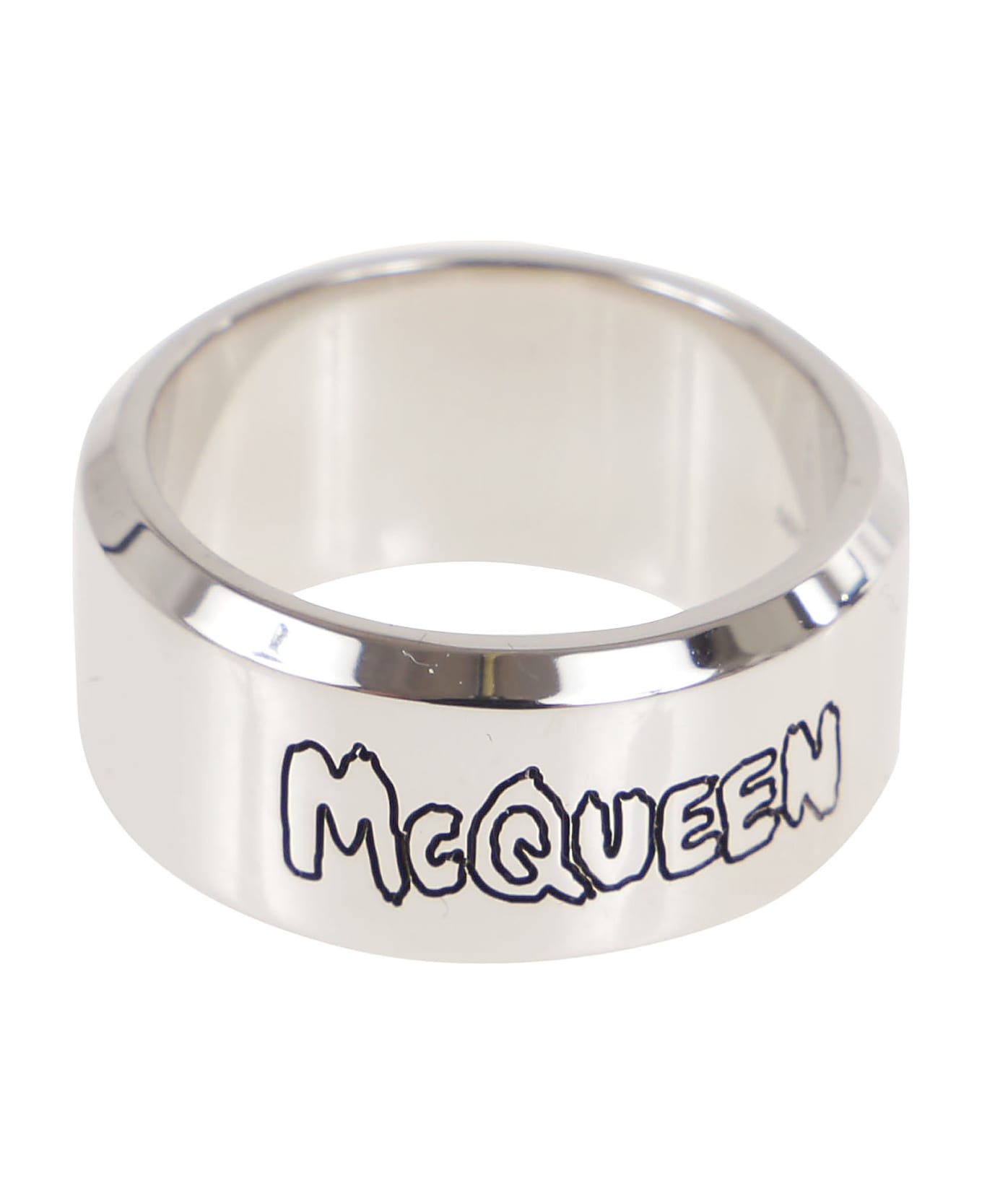 logo-engraved ring from Alexander McQueen featuring black, engraved logo, polished finish and slip-on style.