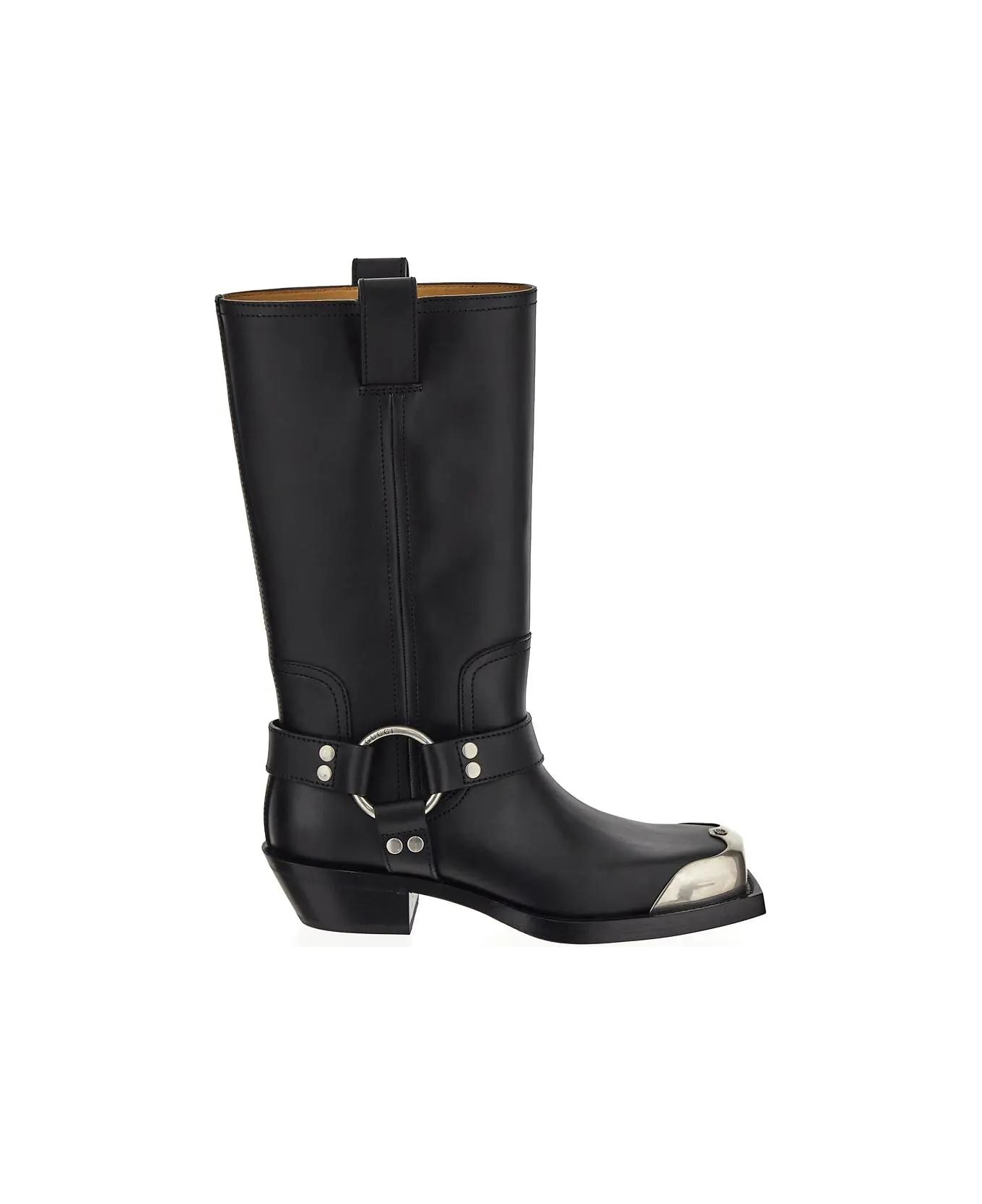 Gucci boot in black leather with harness detail, silver metal square toe with embossed interlocking G, low heel and silver-toned metal details. Composition: 100% Leather