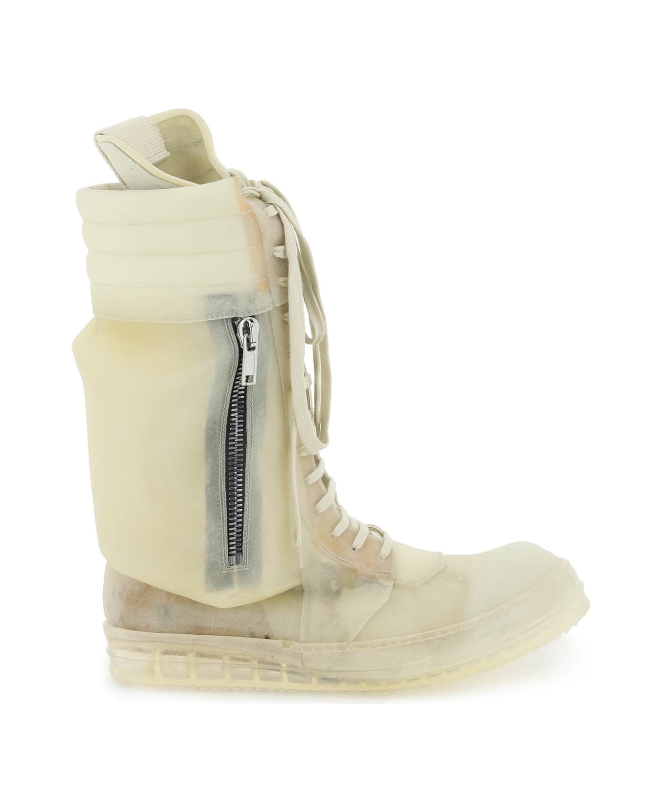 Cargo Basket sneakers by Rick Owens crafted in semi-transparent calf leather, inspired by parchment, processed with a specialized glycerine treatment and characterized by the side cargo pocket with silver-finished metal zip closure. Mid-calf eight, oversized tongue with gros grain trimmings, front lace-up closure and zip on the inner side. Leather lining, shark. tooth rubber sole. Extra laces included.