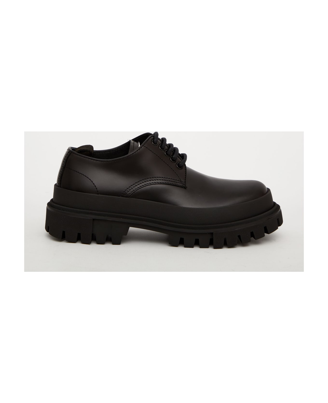 Derby shoes in black leather with branded rubber lug sole. Branded metal plate on tongue.
