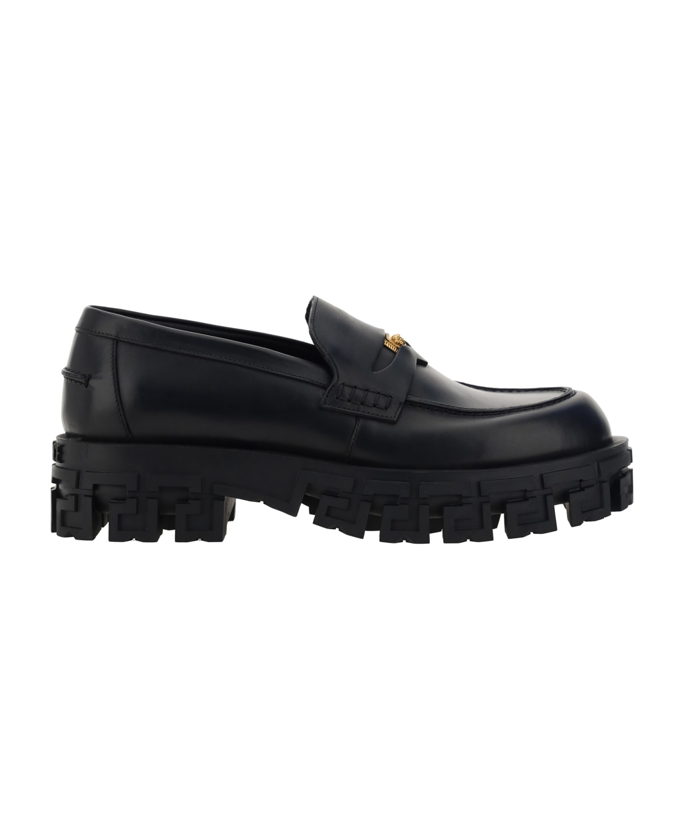 Calfskin loafers by versace, slightly elongated round toe, textured and ridged sole, front tray embellished with brand's iconic embossed medusa logo, logo-embossed insole, slight block heel, polished leather finish.