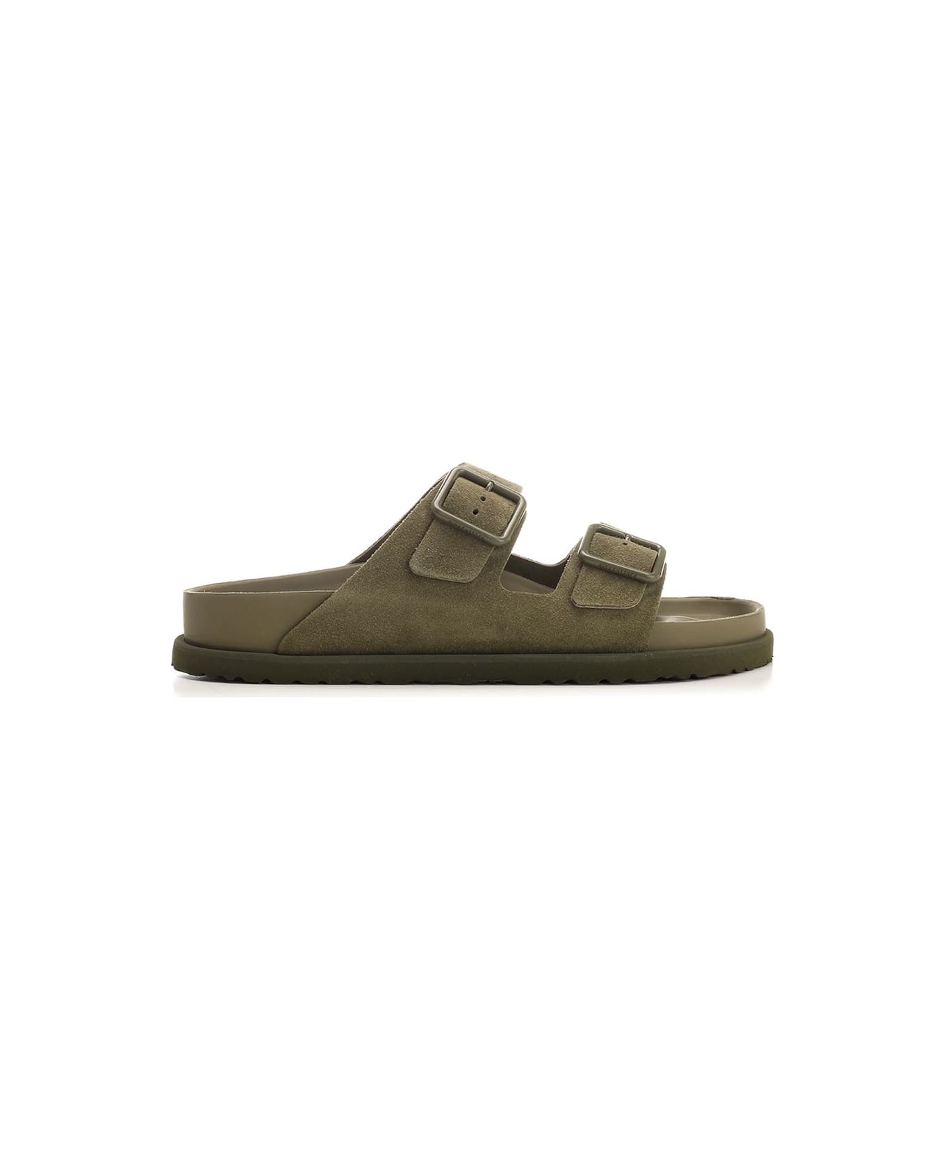 Moss green "1774 Arizona" double buckle sandal from Birkenstock with suede upper and anatomical BIRKENSTOCK cork and latex footbed, covered in smooth nappa leather of the same color.