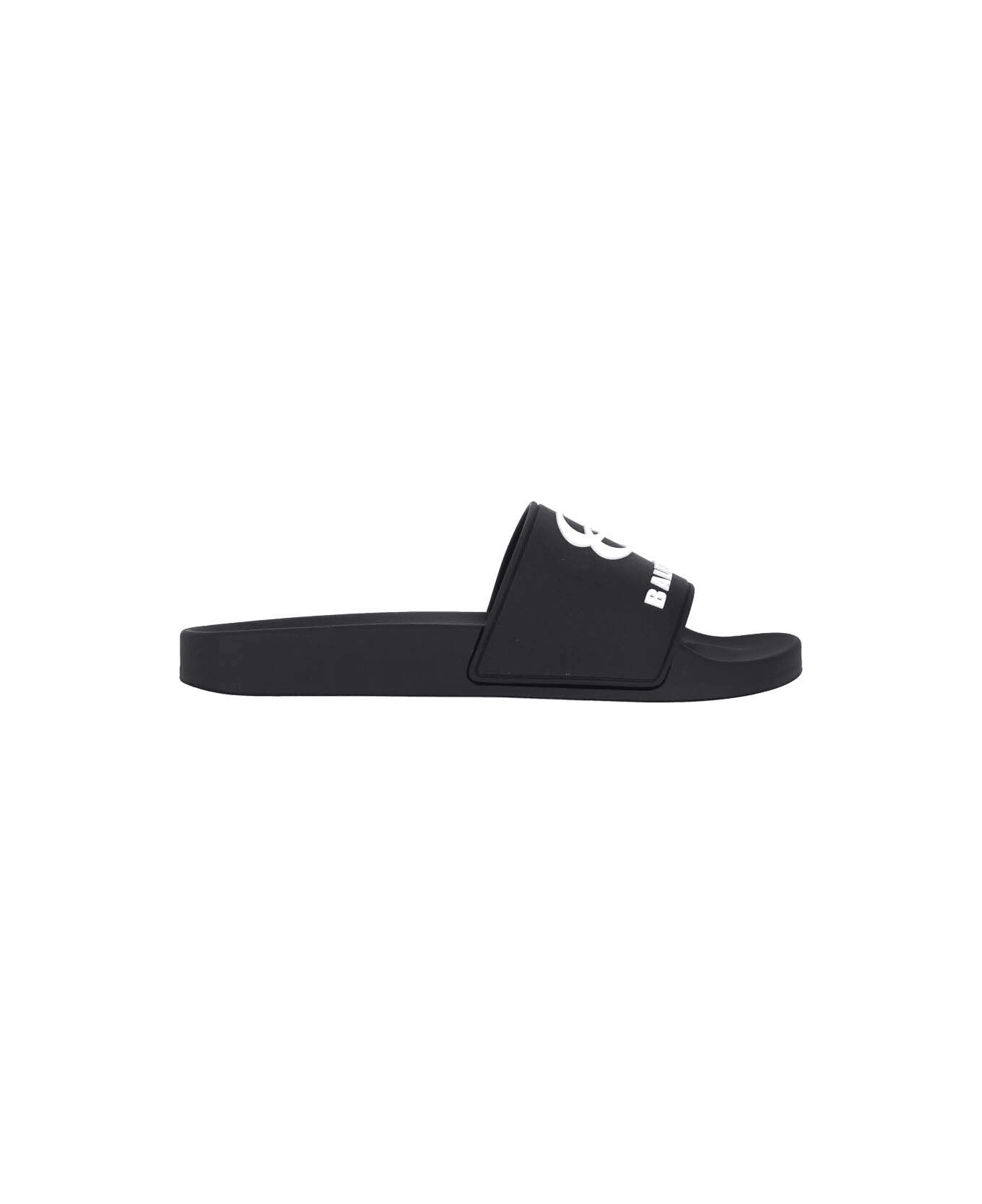 Balenciaga 'Pool' slide sandals in black rubber with round toe, top band, contrasting embossed 'Unity Sports' logo detail, slip-on fit, rubber sole. Composition: 100% Polyurethane